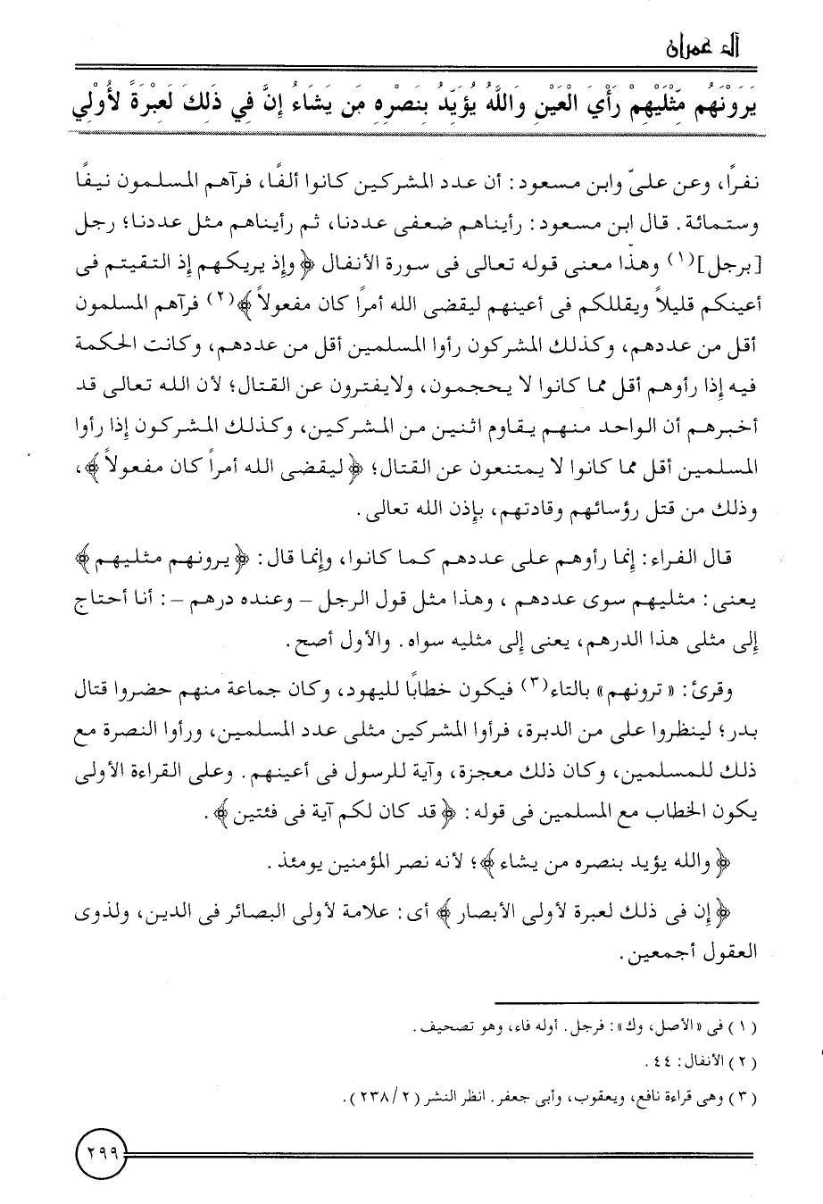 قَالَ الْفراء: إِنَّمَا رَأَوْهُمْ على عَددهمْ كَمَا كَانُوا، وَإِنَّمَا قَالَ: {يرونهم مثليهم} يَعْنِي: مثليهم سوى عَددهمْ، وَهَذَا مثل قَول الرجل - وَعِنْده دِرْهَم -: أَنا أحتاج إِلَى مثلى هَذَا الدِّرْهَم، يَعْنِي إِلَى مثلَيْهِ سواهُ. وَالْأول أصح.