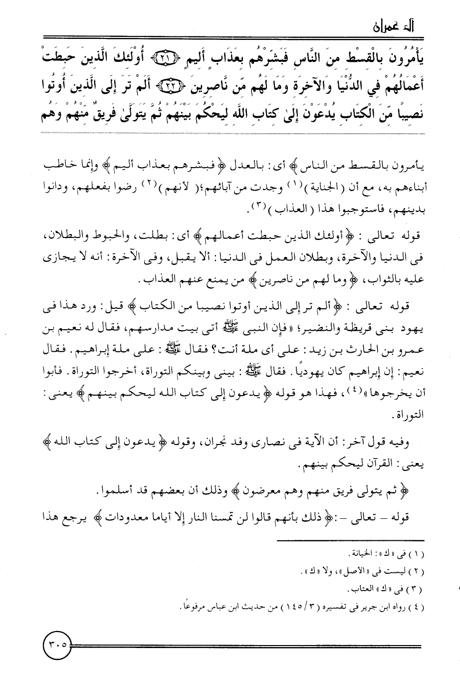 {يأمرون بِالْقِسْطِ من النَّاس فبشرهم بِعَذَاب أَلِيم (21) أُولَئِكَ الَّذين حبطت أَعْمَالهم فِي الدُّنْيَا وَالْآخِرَة وَمَا لَهُم من ناصرين (22) ألم تَرَ إِلَى الَّذين أُوتُوا نَصِيبا من الْكتاب يدعونَ إِلَى كتاب الله ليحكم بَينهم ثمَّ يتَوَلَّى فريق مِنْهُم وهم}