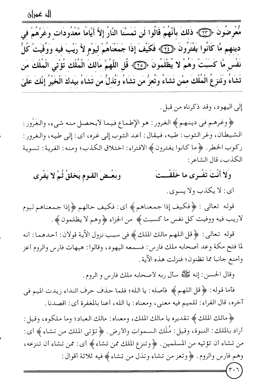 {معرضون (23) ذَلِك بِأَنَّهُم قَالُوا لن تمسنا النَّار إِلَّا أَيَّامًا معدودات وغرهم فِي دينهم مَا كَانُوا يفترون (24) فَكيف إِذا جمعناهم ليَوْم لَا ريب فِيهِ ووفيت كل نفس مَا كسبت وهم لَا يظْلمُونَ (25) قل اللَّهُمَّ مَالك الْملك تؤتي الْملك من تشَاء وننزع الْملك مِمَّن يَشَاء وتعز من تشَاء وتذل من تشَاء بِيَدِك الْخَيْر إِنَّك على}
