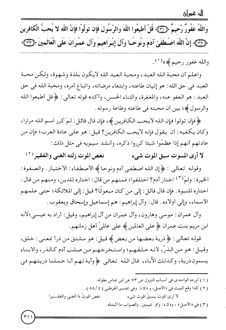 {وَالله غَفُور رَحِيم (31) قل أطِيعُوا الله وَالرَّسُول فَإِن توَلّوا فَإِن الله لَا يحب الْكَافرين (32) إِن الله أصطفى آدم ونوحا وَآل إِبْرَاهِيم وَآل عمرَان على الْعَالمين (33) }