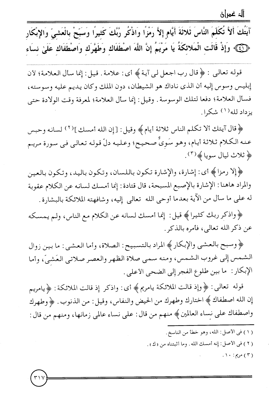 {آيتك أَلا تكلم النَّاس ثَلَاثَة أَيَّام إِلَّا رمزا وَاذْكُر رَبك كثيرا وَسبح بالعشى وَالْإِبْكَار (41) وَإِذا قَالَت الْمَلَائِكَة يَا مَرْيَم إِن الله اصطفاك وطهرك واصطفاك على نسَاء}