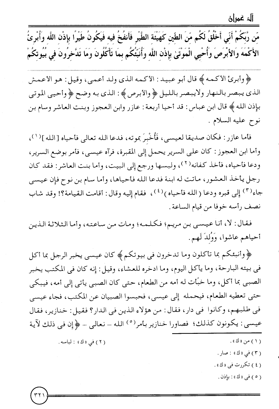 ( {من ربكُم أَنِّي أخلق لكم من الطين كَهَيئَةِ الطير فأنفخ فِيهِ فَيكون طيرا بِإِذن الله وأبرئ الأكمه والأبرص وأحيي الْمَوْتَى بِإِذن الله وأنبئكم بِمَا تَأْكُلُونَ وَمَا تدخرون فِي بُيُوتكُمْ} وأبرىء الأكمه) قَالَ أَبُو عبيد: الأكمه الَّذِي ولد أعمى، وَقيل: هُوَ الْأَعْمَش الَّذِي يبصر بِالنَّهَارِ وَلَا يبصر بِاللَّيْلِ {والأبرص} : الَّذِي بِهِ وضح {وأحيى الْمَوْتَى بِإِذن الله} قَالَ ابْن عَبَّاس: قد أَحْيَا أَرْبَعَة: عازر وَابْن الْعَجُوز وَبنت الْعَاشِر وسام بن نوح عَلَيْهِ السَّلَام.