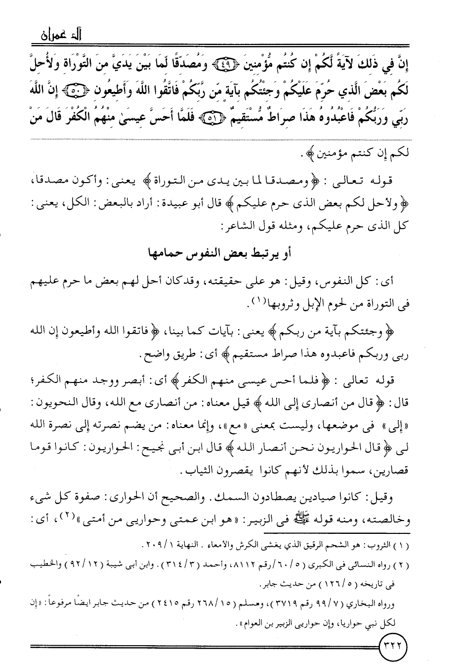 {إِن فِي ذَلِك لآيَة لكم إِن كُنْتُم مُؤمنين (499 ومصدقا لما بَين يَدي من التَّوْرَاة ولأحل لكم بعض الَّذِي حرم عَلَيْكُم وجئتكم بِآيَة من ربكُم فَاتَّقُوا الله وأطيعون (50) إِن الله رَبِّي وربكم فاعبدواه هَذَا صِرَاط مُسْتَقِيم (51) فَلَمَّا أحس عِيسَى مِنْهُم الْكفْر قَالَ من}