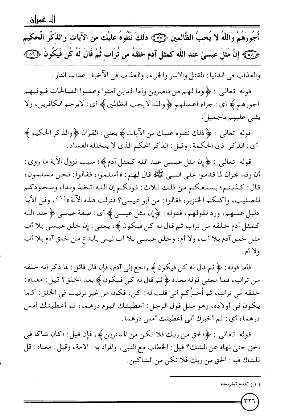 {أُجُورهم وَالله لَا يحب الظَّالِمين (57) ذَلِك نتلوه عَلَيْك من الْآيَات وَالذكر الْحَكِيم (58) إِن مثل عِيسَى عِنْد الله كَمثل آدم خلقه من تُرَاب ثمَّ قَالَ لَهُ كن فَيكون (59) }