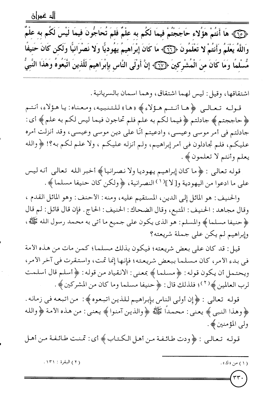 ( {65) هَا أَنْتُم هَؤُلَاءِ حاججتم فِيمَا لكم بِهِ علم فَلم تحاجون فِيمَا لَيْسَ لكم بِهِ علم وَالله يعلم وَأَنْتُم لَا تعلمُونَ (66) مَا كَانَ إِبْرَاهِيم يَهُودِيّا وَلَا نَصْرَانِيّا وَلَكِن كَانَ حَنِيفا مُسلما وَمَا كَانَ من الْمُشْركين (67) إِن أولى النَّاس بإبراهيم للَّذين اتَّبعُوهُ وَهَذَا النَّبِي}