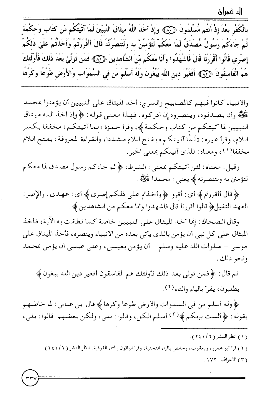 والأنبياء كَانُوا فيهم كالمصابيح والسرج، أَخذ الْمِيثَاق على النَّبِيين أَن يُؤمنُوا بِمُحَمد وَأَن يصدقوه، وينصروه إِن أدركوه. فَهَذَا معنى قَوْله: {وَإِذ أَخذ الله مِيثَاق النَّبِيين لما آتيتكم من كتاب وَحِكْمَة} ، وَقَرَأَ حَمْزَة " لما آتيتكم " مخففا بِكَسْر اللَّام، وَقَرَأَ غَيره: " لما آتيتكم " بِفَتْح اللَّام مشددا، وَالْقِرَاءَة الْمَعْرُوفَة: بِفَتْح اللَّام مخففا، وَمَعْنَاهُ: للَّذي آتيتكم بِمَعْنى الْخَبَر.