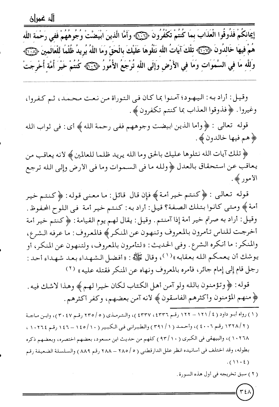 قَوْله تَعَالَى: {كُنْتُم خير أمة} فَإِن قَالَ قَائِل: مَا معنى قَوْله: {كُنْتُم خير أمة} وَمَتى كَانُوا بِتِلْكَ الصّفة؟ قيل: أَرَادَ بِهِ: كُنْتُم خير أمة فِي اللَّوْح الْمَحْفُوظ. وَقيل: أَرَادَ بِهِ صرتم خير أمة إِذا آمنتم. وَقيل: يُقَال لَهُم يَوْم الْقِيَامَة: {كُنْتُم خير أمة أخرجت للنَّاس تأمرون بِالْمَعْرُوفِ وتنهون عَن الْمُنكر} فالمعروف: مَا عرفه الشَّرْع، وَالْمُنكر: مَا أنكرهُ الشَّرْع. وَفِي الحَدِيث: " لتأمرون بِالْمَعْرُوفِ، ولتنهون عَن الْمُنكر، أَو يُوشك أَن يعمكم الله بعقابه "، وَقَالَ: " أفضل الشُّهَدَاء بعد شُهَدَاء أحد: رجل قَامَ إِلَى إِمَام جَائِر، فَأمره بِالْمَعْرُوفِ وَنَهَاهُ عَن الْمُنكر فَقتله عَلَيْهِ ".