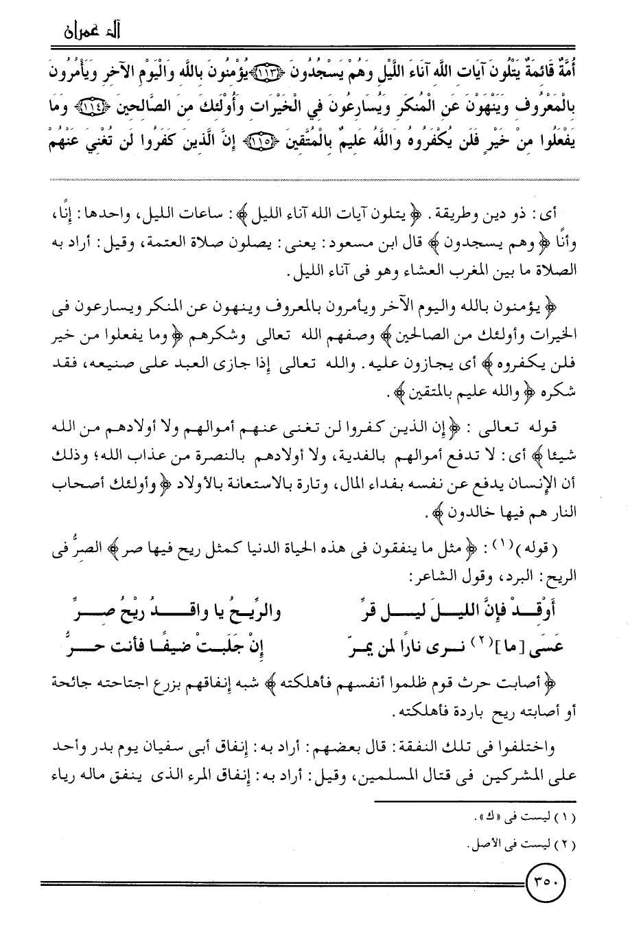 {أمة قَائِمَة يَتلون آيَات الله آنَاء اللَّيْل وهم يَسْجُدُونَ (113) يُؤمنُونَ بِاللَّه وَالْيَوْم الآخر ويأمرون بِالْمَعْرُوفِ وَينْهَوْنَ عَن الْمُنكر ويسارعون فِي الْخيرَات وَأُولَئِكَ من الصَّالِحين (114) وَمَا يَفْعَلُوا من خير فَلَنْ يكفروه وَالله عليم بالمتقين (115) إِن الَّذين كفرُوا لن تغني عَنْهُم}