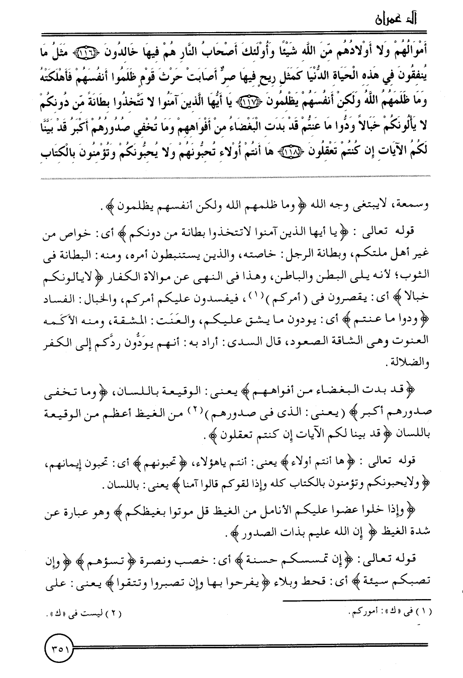 {أَمْوَالهم وَلَا أَوْلَادهم من الله شَيْئا وَأُولَئِكَ أَصْحَاب النَّار هم فِيهَا خَالدُونَ (116) مثل مَا يُنْفقُونَ فِي هَذِه الْحَيَاة الدُّنْيَا كَمثل ريح فِيهَا صر أَصَابَت حرث قوم ظلمُوا أنفسهم فأهلكته وَمَا ظلمهم الله وَلَكِن أنفسهم يظْلمُونَ (117) يَا أَيهَا الَّذين آمنُوا لَا تَتَّخِذُوا بطانة من دونكم لَا يأولونكم خبالا ودوا مَا عنتم قد بَدَت الْبغضَاء من أَفْوَاههم وَمَا تخفي صُدُورهمْ أكبر قد بَينا لكم الْآيَات إِن كُنْتُم تعقلون (118) هَا أَنْتُم أولاء تحبونهم وَلَا يحبونكم وتؤمنون بِالْكتاب}