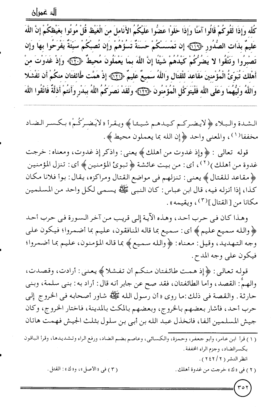 {كُله وَإِذا لقوكم قَالُوا آمنا وَإِذا خلوا عضوا عَلَيْكُم الأنامل من الغيظ قل موتوا بغيظكم إِن الله عليم بِذَات الصُّدُور (119) إِن تمسسكم حَسَنَة تسؤهم وَإِن تصبكم سَيِّئَة يفرحوا بهَا وَإِن تصبروا وتتقوا لَا يضركم كيدهم شَيْئا أَن الله بِمَا يعْملُونَ مُحِيط (120) وَإِذ غَدَوْت من أهلك تبوئ الْمُؤمنِينَ مقاعد لِلْقِتَالِ وَالله سميع عليم (121) إِذْ هَمت طَائِفَتَانِ مِنْكُم أَن تَفْشَلَا وَالله وليهما وعَلى الله فَليَتَوَكَّل الْمُؤْمِنُونَ (122) وَلَقَد نصركم الله ببدر وَأَنْتُم أَذِلَّة فَاتَّقُوا الله} الشدَّة وَالْبَلَاء {لَا يضركم كيدهم شَيْئا} وَيقْرَأ " لَا يضركم " بِكَسْر الضَّاد مخففا، وَالْمعْنَى وَاحِد {إِن الله بِمَا يعْملُونَ مُحِيط} .