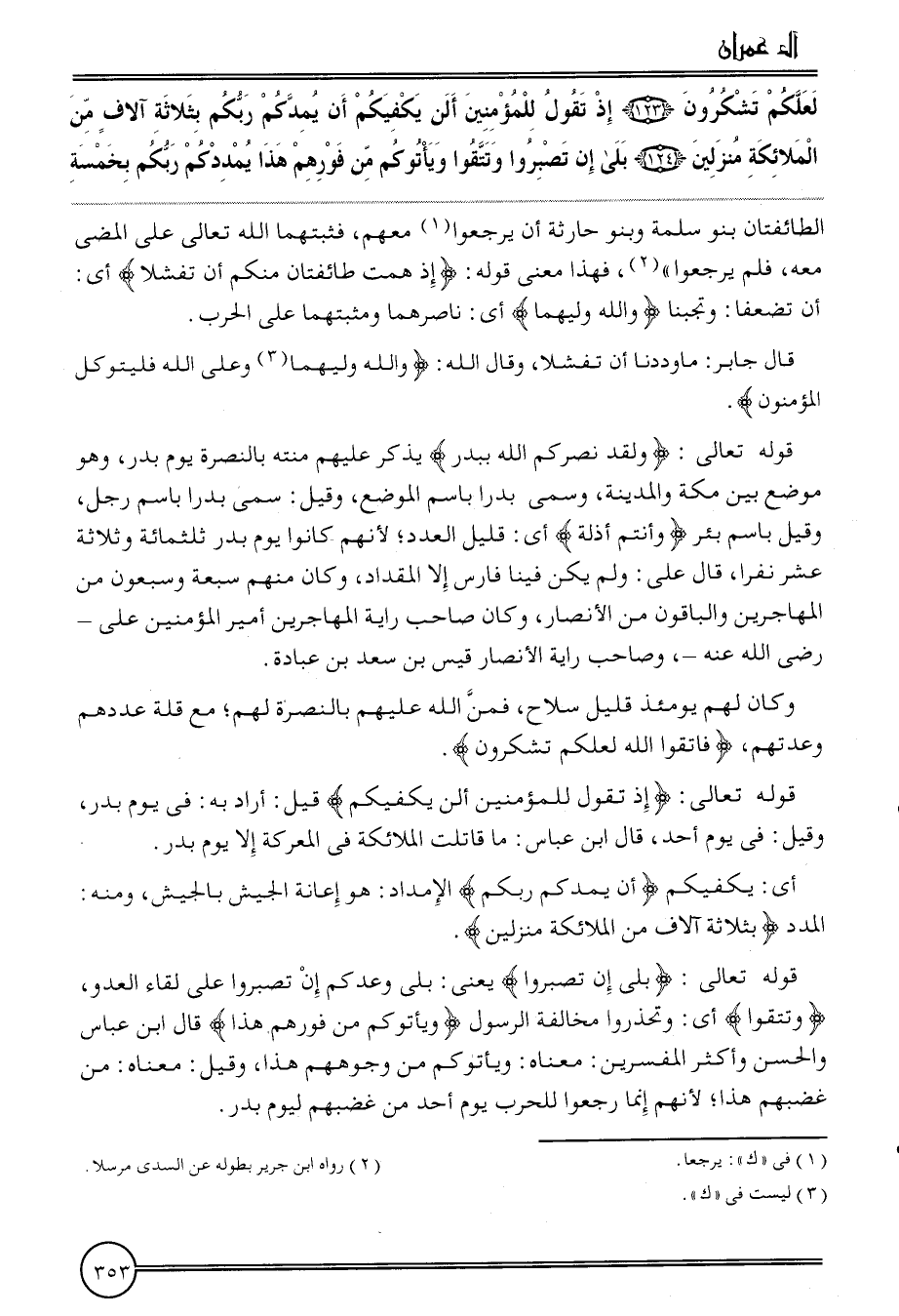 {لَعَلَّكُمْ تشكرون (123) إِذْ تَقول للْمُؤْمِنين ألن يكفيكم أَن يمدكم ربكُم بِثَلَاثَة آلَاف من الْمَلَائِكَة منزلين (124) بلَى إِن تصبروا وتتقوا ويأتوكم من فورهم هَذَا يمددكم ربكُم بِخَمْسَة}