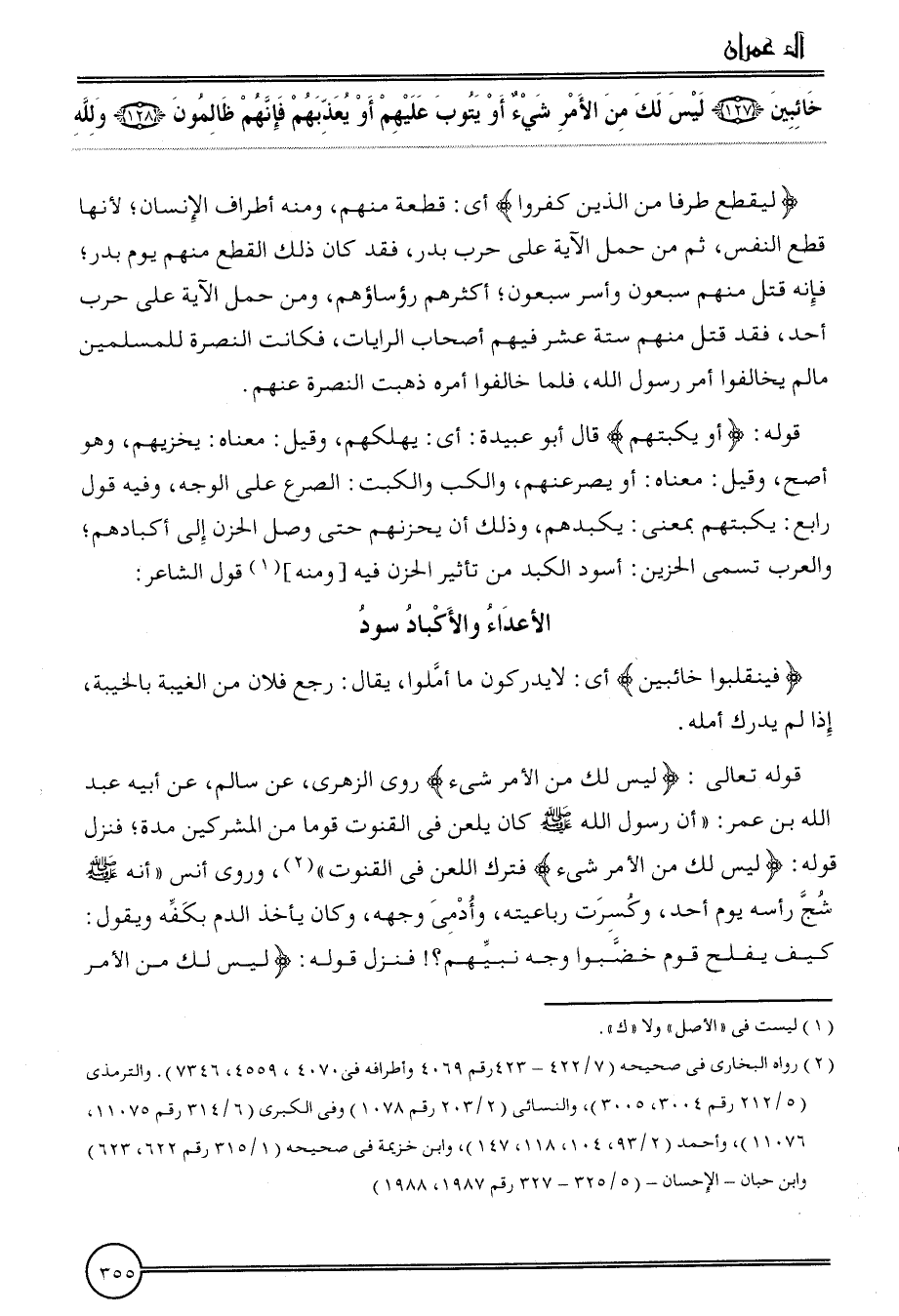 قَوْله تَعَالَى: {لَيْسَ لَك من الْأَمر شَيْء} روى الزُّهْرِيّ، عَن سَالم، عَن أَبِيه عبد الله بن عمر: " {لَيْسَ لَك من الْأَمر شَيْء} فَترك اللَّعْن فِي الْقُنُوت "، وروى أنس " أَنه شج رَأسه يَوْم أحد، وَكسرت رباعيته، وأدمي وَجهه، وَكَانَ يَأْخُذ الدَّم بكفه وَيَقُول: كَيفَ يفلح قوم خضبوا وَجه نَبِيّهم؟ ! فَنزل قَوْله: {لَيْسَ لَك من الْأَمر