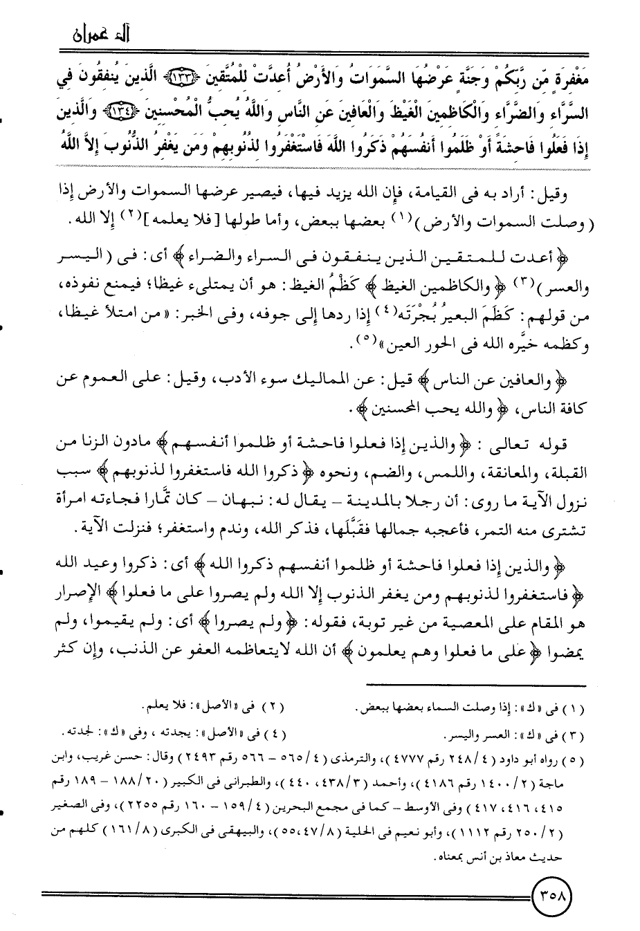 {مغْفرَة من ربكُم وجنة عرضهَا السَّمَوَات وَالْأَرْض أعدت لِلْمُتقين (133) الَّذين يُنْفقُونَ فِي السَّرَّاء وَالضَّرَّاء والكاظمين الغيظ وَالْعَافِينَ عَن النَّاس وَالله يحب الْمُحْسِنِينَ (134) وَالَّذين إِذا فعلوا فَاحِشَة أَو ظلمُوا أنفسهم ذكرُوا الله فاستغفروا لذنوبهم وَمن يغْفر الذُّنُوب إِلَّا الله}