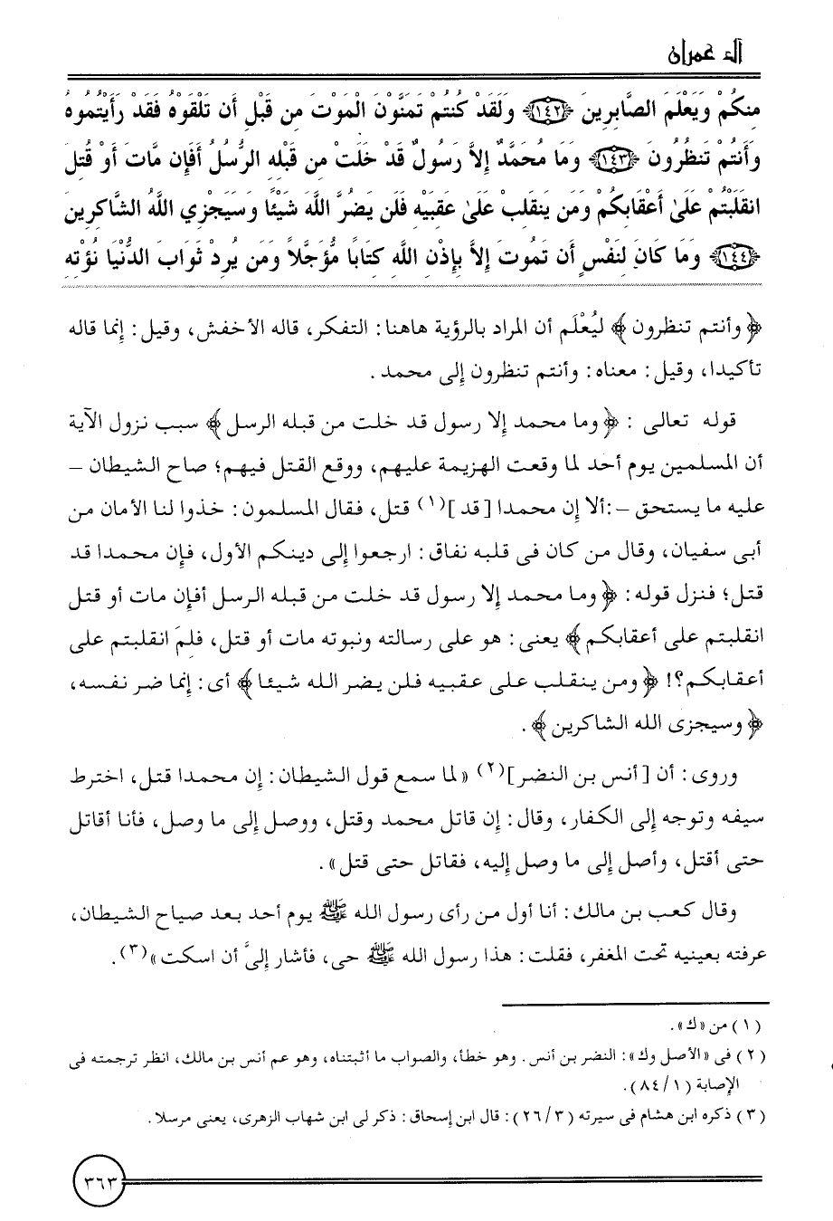 {مِنْكُم وَيعلم الصابرين (142) وَلَقَد كُنْتُم تمنون الْمَوْت من قبل أَن تلقوهُ فقد رَأَيْتُمُوهُ وَأَنْتُم تنْظرُون (143) وَمَا مُحَمَّد إِلَّا رَسُول قد خلت من قبله الرُّسُل أَفَإِن مَاتَ أَو قتل انقلبتم على أعقابكم وَمن يَنْقَلِب على عَقِبَيْهِ فَلَنْ يضر الله شَيْئا وسيجزي الله الشَّاكِرِينَ (144) وَمَا كَانَ لنَفس أَن تَمُوت إِلَّا بِإِذن الله كتابا مُؤَجّلا وَمن يرد ثَوَاب الدُّنْيَا نؤته}