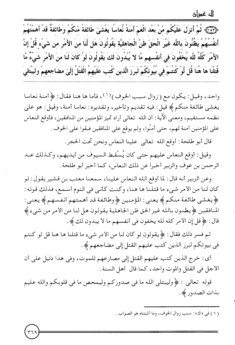 ( {153) ثمَّ أنزل عَلَيْكُم من بعد الْغم أَمَنَة نعاسا يغشى طَائِفَة مِنْكُم وَطَائِفَة قد أهمتهم أنفسهم يظنون بِاللَّه غير الْحق ظن الْجَاهِلِيَّة يَقُولُونَ هَل لنا من الْأَمر من شَيْء قل إِن الْأَمر كُله لله يخفون فِي أنفسهم مَا لَا يبدون لَك يَقُولُونَ لَو كَانَ لنا من الْأَمر شَيْء مَا قتلنَا هَا هُنَا قل لَو كُنْتُم فِي بُيُوتكُمْ لبرز الَّذين كتب عَلَيْهِم الْقَتْل إِلَى مضاجعهم وليبتلي}