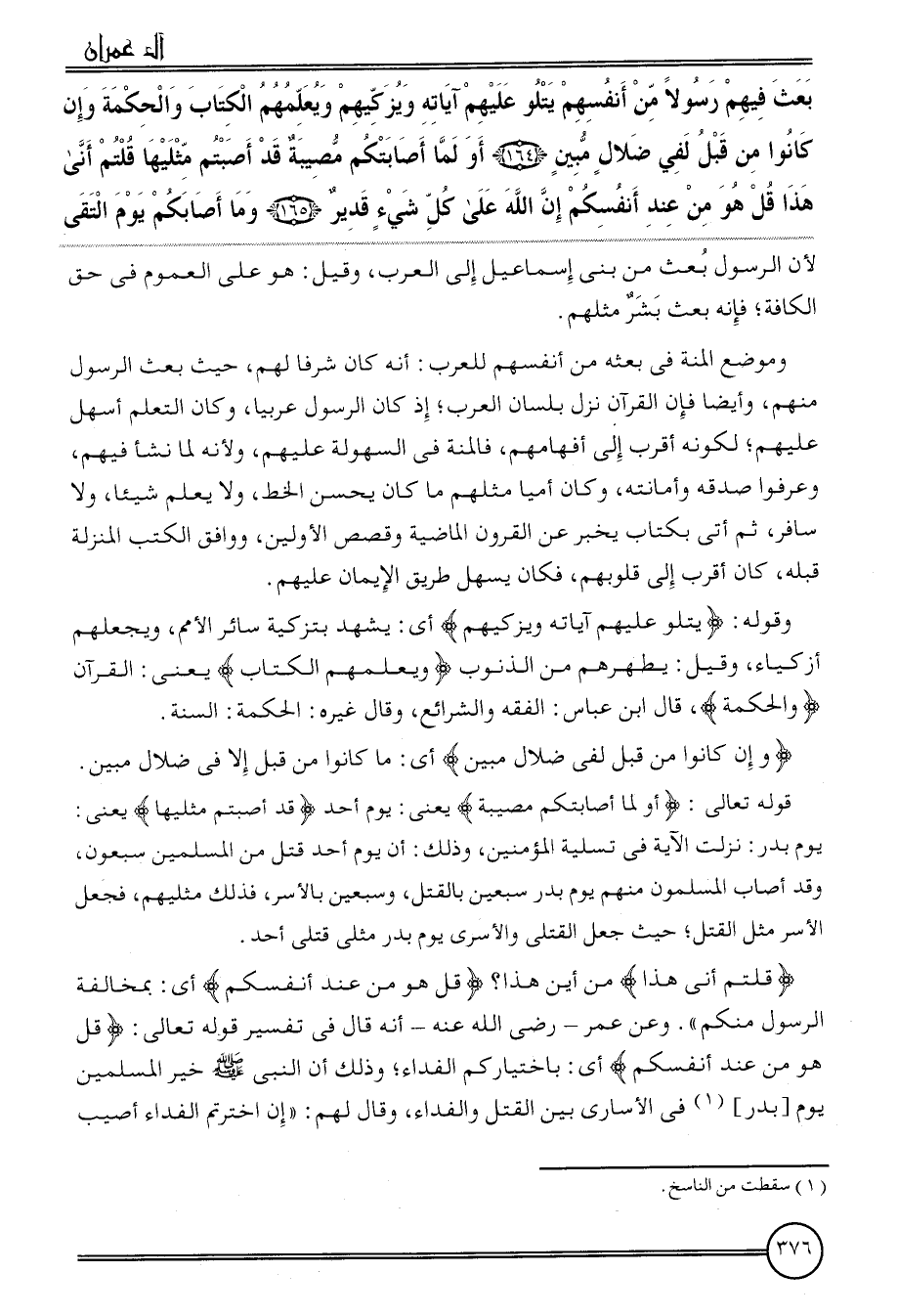 {بعث فيهم رَسُولا من أنفسهم يَتْلُوا عَلَيْهِم آيَاته ويزكيهم وَيُعلمهُم الْكتاب وَالْحكمَة وَإِن كَانُوا من قبل لفي ضلال مُبين (164) أَو لما أَصَابَتْكُم مُصِيبَة قد أصبْتُم مثليها قُلْتُمْ أَنى هَذَا قل هُوَ من عِنْد أَنفسكُم إِن الله على كل شَيْء قدير (165) وَمَا أَصَابَكُم يَوْم التقى}