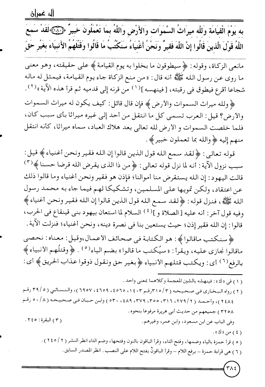 {بِهِ يَوْم الْقِيَامَة وَللَّه مِيرَاث السَّمَوَات وَالْأَرْض وَالله بِمَا تَعْمَلُونَ خَبِير (180) لقد سمع الله قَول الَّذين قَالُوا إِن الله فَقير وَنحن أَغْنِيَاء سنكتب مَا قَالُوا وقتلهم الْأَنْبِيَاء بِغَيْر حق}