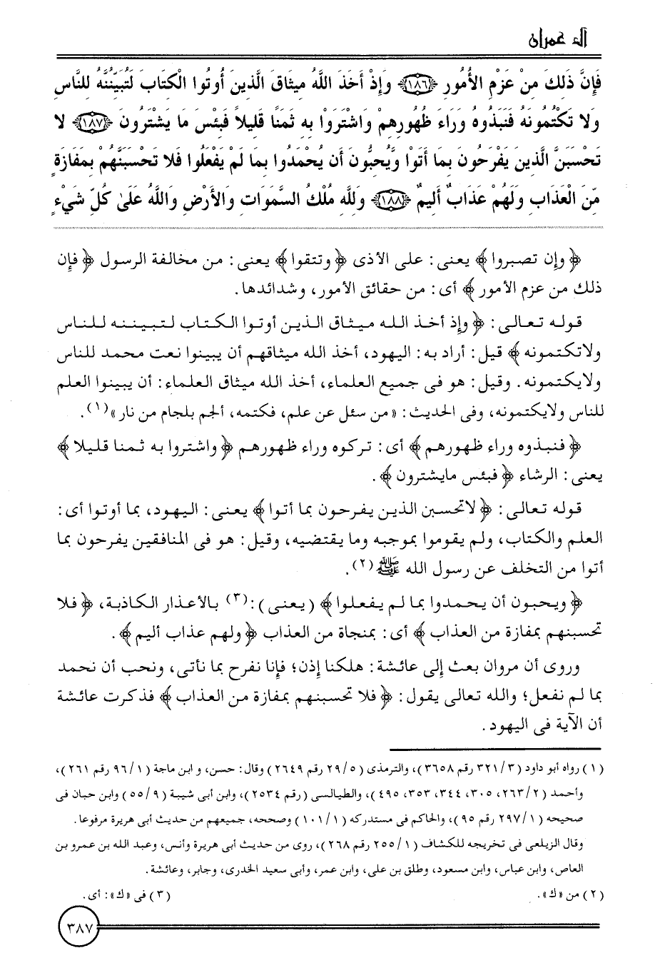 {فَإِن ذَلِك من عزم الْأُمُور (186) وَإِذ أَخذ الله مِيثَاق الَّذين أُوتُوا الْكتاب لتبينه للنَّاس وَلَا تكتمونه فنبذوه وَرَاء ظُهُورهمْ واشتروا بِهِ ثمنا قَلِيلا فبئس مَا يشْتَرونَ (187) لَا تحسبن الَّذين يفرحون بِمَا أُوتُوا وَيُحِبُّونَ أَن يحْمَدُوا بِمَا لم يَفْعَلُوا فَلَا تحسبنهم بمفازة من الْعَذَاب وَلَهُم عَذَاب أَلِيم (188) وَللَّه ملك السَّمَوَات وَالْأَرْض وَالله على كل شَيْء}
