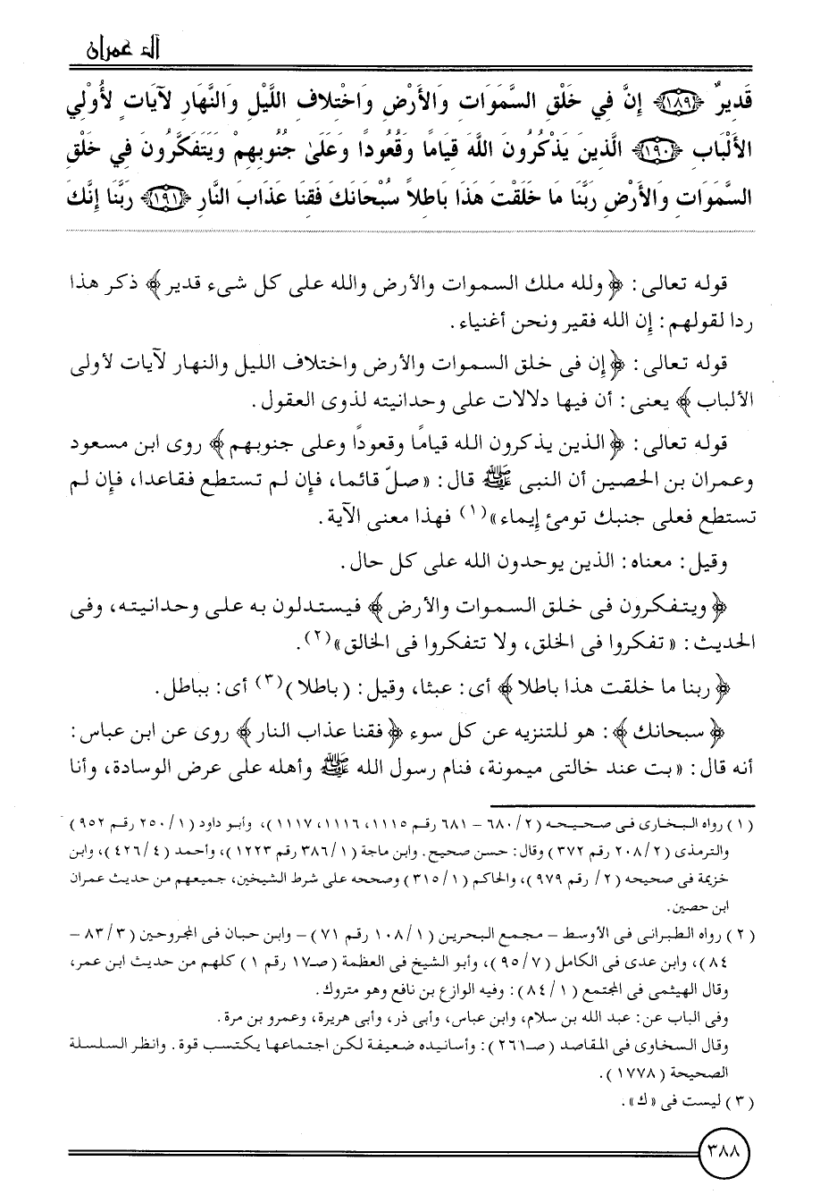 {قدير (189) إِن فِي خلق السَّمَوَات وَالْأَرْض وَاخْتِلَاف اللَّيْل وَالنَّهَار لآيَات لأولي الْأَلْبَاب (190) الَّذين يذكرُونَ الله قيَاما وقعودا وعَلى جنُوبهم ويتفكرون فِي خلق السَّمَوَات وَالْأَرْض رَبنَا مَا خلقت هَذَا بَاطِلا سُبْحَانَكَ فقنا عَذَاب النَّار (191) رَبنَا إِنَّك}