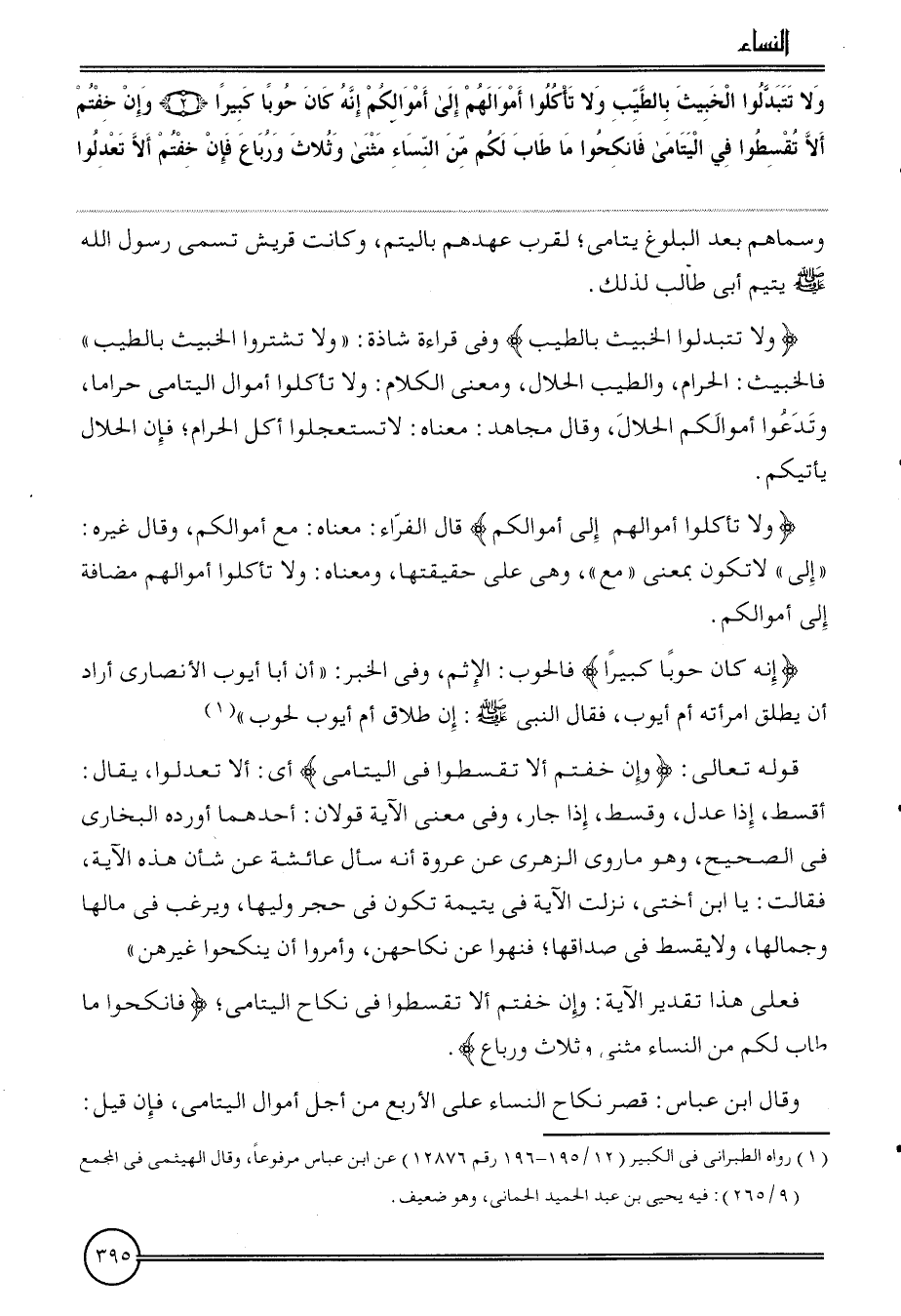 {وَلَا تتبدلوا الْخَبيث بالطيب وَلَا تَأْكُلُوا أَمْوَالهم إِلَى أَمْوَالكُم إِنَّه كَانَ حوبا كَبِيرا (2) وَإِن خِفْتُمْ أَلا تقسطوا فِي الْيَتَامَى فانكحوا مَا طَابَ لكم من النِّسَاء مثنى وَثَلَاث وَربَاع فَإِن خِفْتُمْ أَلا تعدلوا} وَسَمَّاهُمْ بعد الْبلُوغ يتامى؛ لقرب عَهدهم باليتيم، وَكَانَت قُرَيْش تسمي رَسُول الله يَتِيم أبي طَالب لذَلِك.