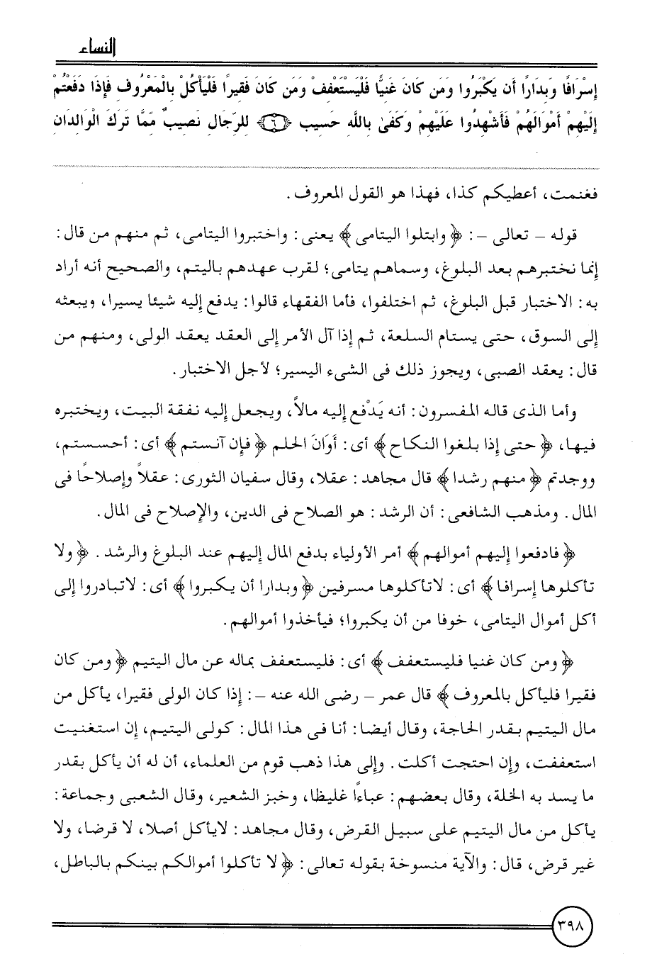 وَأما الَّذِي قَالَه الْمُفَسِّرُونَ: أَنه يدْفع إِلَيْهِ مَالا، وَيجْعَل إِلَيْهِ نَفَقَة الْبَيْت، ويختبره فِيهَا، {حَتَّى إِذا بلغُوا النِّكَاح} أَي: أَوَان الْحلم {فَإِن آنستم} أَي: أحسستم، ووجدتم {مِنْهُم رشدا} قَالَ مُجَاهِد: عقلا، وَقَالَ سُفْيَان الثَّوْريّ: عقلا وإصلاحا فِي المَال. وَمذهب الشَّافِعِي: أَن الرشد: هُوَ الصّلاح فِي الدّين، والإصلاح فِي المَال.