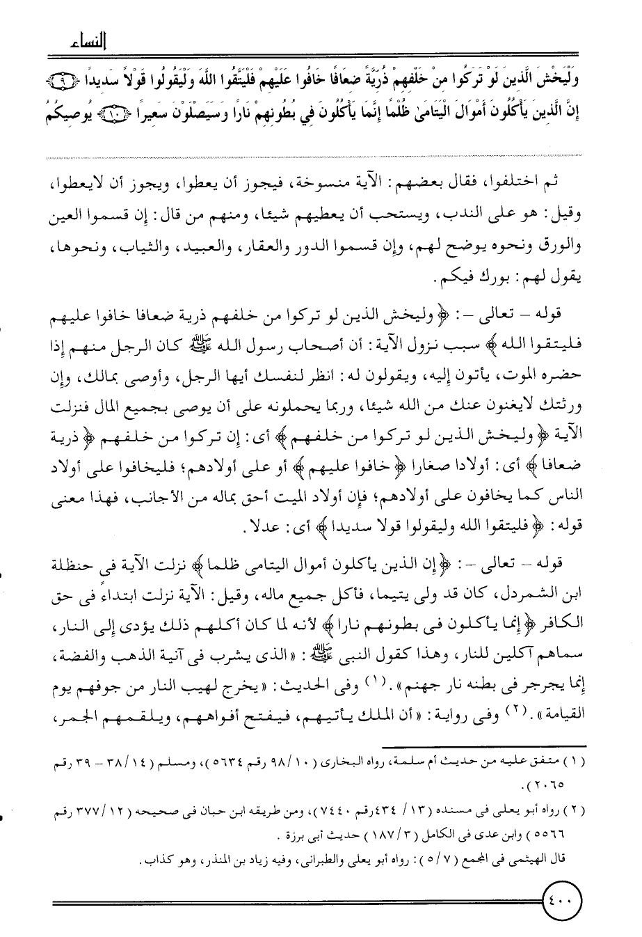 قَوْله تَعَالَى: {وليخش الَّذين لَو تركُوا من خَلفهم ذُرِّيَّة ضعافا خَافُوا عَلَيْهِم فليتقوا الله} سَبَب نزُول الْآيَة: أَن أَصْحَاب رَسُول الله كَانَ الرجل مِنْهُم إِذا حَضَره الْمَوْت، يأْتونَ إِلَيْهِ، وَيَقُولُونَ لَهُ: انْظُر لنَفسك أَيهَا الرجل، وأوصي بِمَالك، وَإِن وَرثتك لَا يغنون عَنْك من الله شَيْئا، وَرُبمَا يحملونه على أَن يُوصي بِجَمِيعِ المَال فَنزلت الْآيَة {وليخش الَّذين لَو تركُوا من خَلفهم} أَي: إِن تركُوا من خَلفهم {ذُرِّيَّة ضعافا} أَي: أَوْلَاد صغَارًا {خَافُوا عَلَيْهِم} أَو على أَوْلَادهم؛ فليخافوا على أَوْلَاد النَّاس كَمَا يخَافُونَ على أَوْلَادهم؛ فَإِن أَوْلَاد الْمَيِّت أَحَق بِمَالِه من الْأَجَانِب، فَهَذَا معنى قَوْله: {فليتقوا الله وليقولوا قولا سديدا} أَي: عدلا.