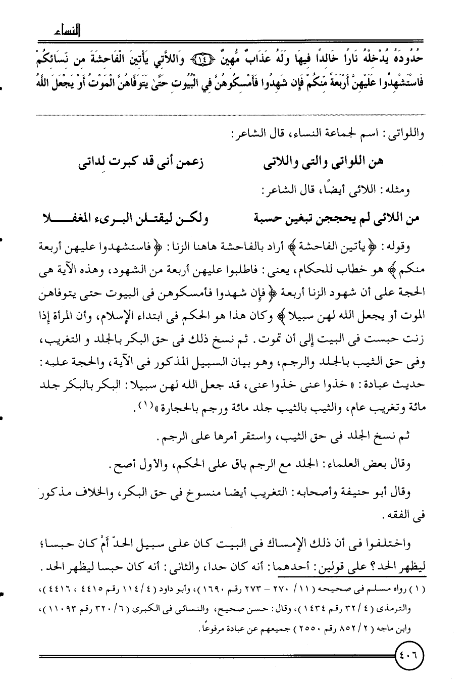 وَقَوله: {يَأْتِين الْفَاحِشَة} أَرَادَ بالفاحشة هَاهُنَا الزِّنَا: {فاستشهدوا عَلَيْهِنَّ أَرْبَعَة مِنْكُم} هُوَ خطاب للحكام، يَعْنِي: فَاطْلُبُوا عَلَيْهِنَّ أَرْبَعَة من الشُّهُود، وَهَذِه الْآيَة هِيَ الْحجَّة على أَن شُهُود الزِّنَا أَرْبَعَة {فَإِن شهدُوا فأمسكوهن فِي الْبيُوت حَتَّى يتوفاهن الْمَوْت أَو يَجْعَل الله لَهُنَّ سَبِيلا} وَكَانَ هَذَا هُوَ الحكم فِي ابْتِدَاء الْإِسْلَام، وَأَن الْمَرْأَة إِذا زنت حبست فِي الْبَيْت إِلَى أَن تَمُوت. ثمَّ نسخ ذَلِك فِي حق الْبكر بِالْجلدِ والتغريب، وَفِي حق الثّيّب بِالْجلدِ وَالرَّجم، وَهُوَ بَيَان السَّبِيل الْمَذْكُور فِي الْآيَة، وَالْحجّة عَلَيْهِ: حَدِيث عبَادَة: " خُذُوا عني خُذُوا عني، قد جعل الله لَهُنَّ سَبِيلا: الْبكر بالبكر جلد مائَة وتغريب عَام؛ وَالثَّيِّب بِالثَّيِّبِ جلد مائَة ورجم بِالْحِجَارَةِ ".