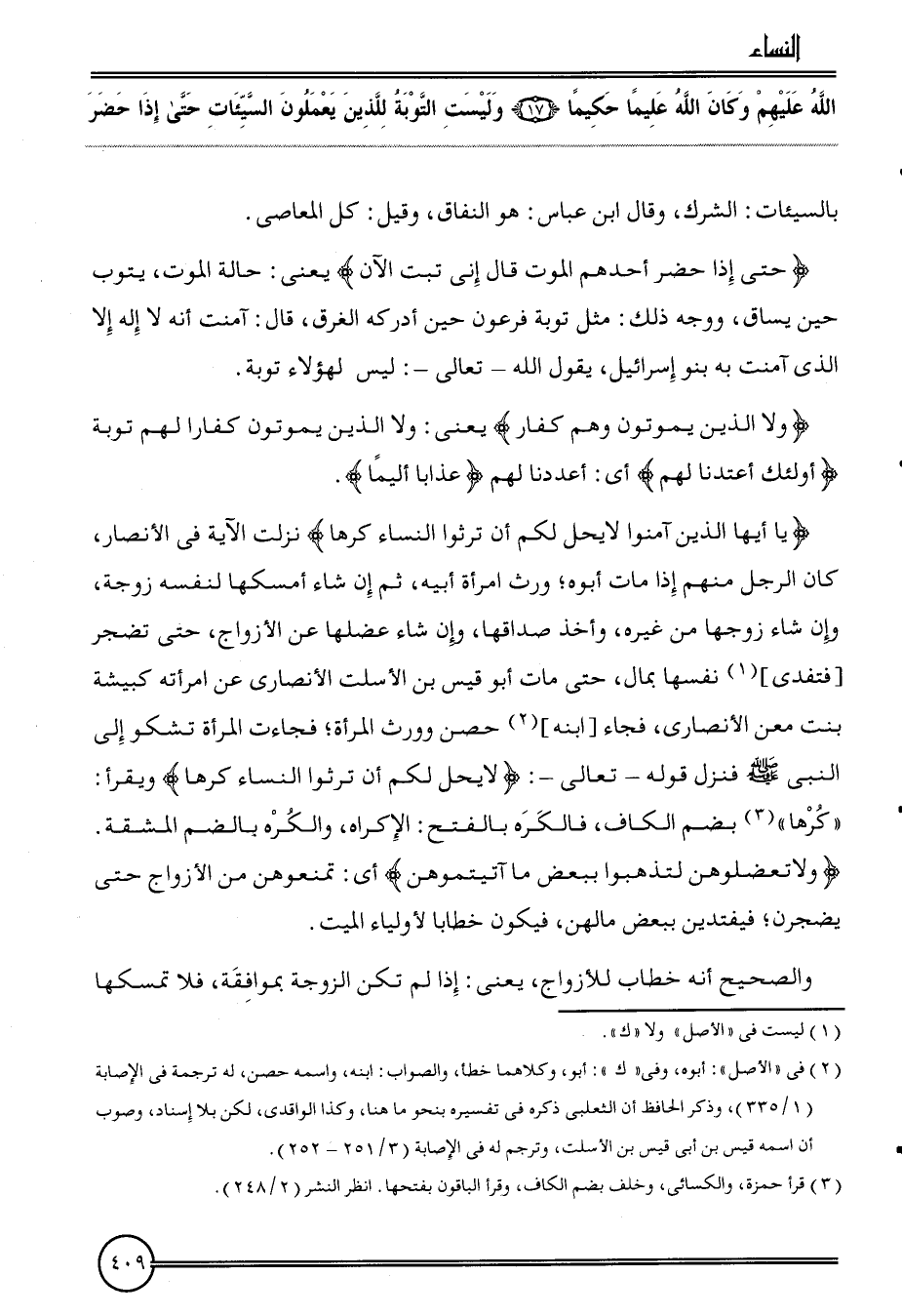 يَا أَيهَا الَّذين آمنُوا لَا يحل لكم أَن ترثوا النِّسَاء كرها) نزلت الْآيَة فِي الْأَنْصَار، كَانَ الرجل مِنْهُم إِذا مَاتَ أَبوهُ؛ ورث امْرَأَة أَبِيه، ثمَّ إِن شَاءَ أمْسكهَا لنَفسِهِ زَوْجَة، وَإِن شَاءَ زَوجهَا من غَيره، وَأخذ صَدَاقهَا، وَإِن شَاءَ عضلها عَن الْأزْوَاج، حَتَّى تضجر [فتفدي] نَفسهَا بِمَال، حَتَّى مَاتَ أَبُو قيس بن الأسلت الْأنْصَارِيّ عَن امْرَأَته كبيشة بنت معن الْأنْصَارِيّ، فجَاء [ابْنه] حصن وَورث الْمَرْأَة؛ فَجَاءَت الْمَرْأَة تَشْكُو إِلَى النَّبِي فَنزل قَوْله - تَعَالَى -: {لَا يحل لكم أَن ترثوا النِّسَاء كرها} وَيقْرَأ: " كرها " بِضَم الْكَاف، فالكره بِالْفَتْح: الْإِكْرَاه، والكره بِالضَّمِّ الْمَشَقَّة. {وَلَا تعضلوهن لتذهبوا بِبَعْض مَا آتَيْتُمُوهُنَّ} أَي: تمنعوهن من الْأزْوَاج حَتَّى يضجرن؛ فيفتدين بِبَعْض مالهن، فَيكون خطابا لأولياء الْمَيِّت.