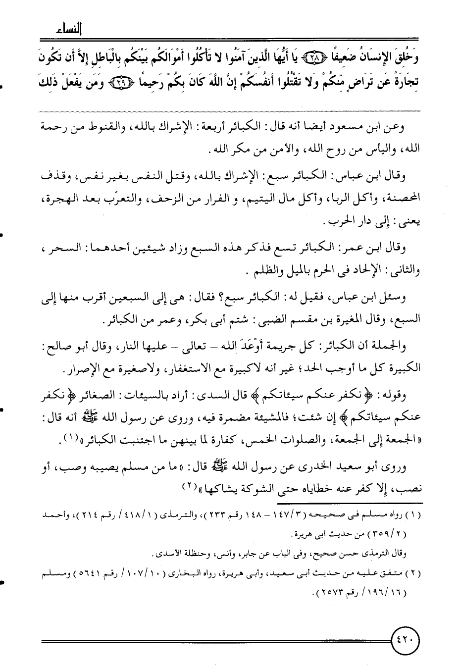وَقَالَ ابْن عَبَّاس: الْكَبَائِر سبع: الْإِشْرَاك بِاللَّه، وَقتل النَّفس بِغَيْر نفس، وَقذف المحصنة، وَأكل الرِّبَا، وَأكل مَال الْيَتِيم، والفرار من الزَّحْف، وَالتَّعَرُّب بعد الْهِجْرَة، يَعْنِي: إِلَى دَار الْحَرْب.
