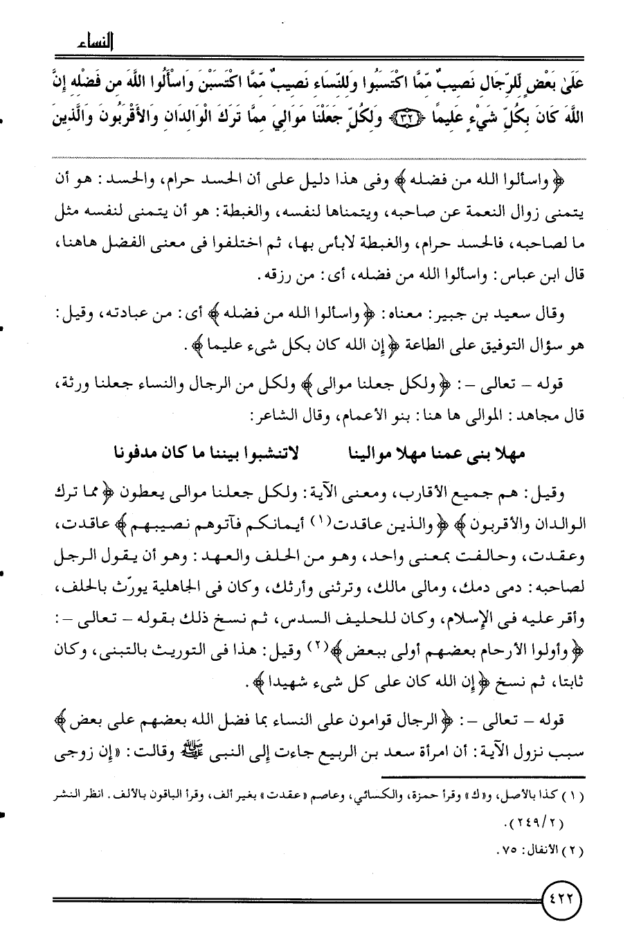 {على بعض للرِّجَال نصيب مِمَّا اكتسبوا وللنساء نصيب مِمَّا اكتسبن واسألوا الله من فَضله إِن الله كَانَ بِكُل شئ عليما (32) وَلكُل جعلنَا موَالِي مِمَّا ترك الْوَالِدَان وَالْأَقْرَبُونَ وَالَّذين}