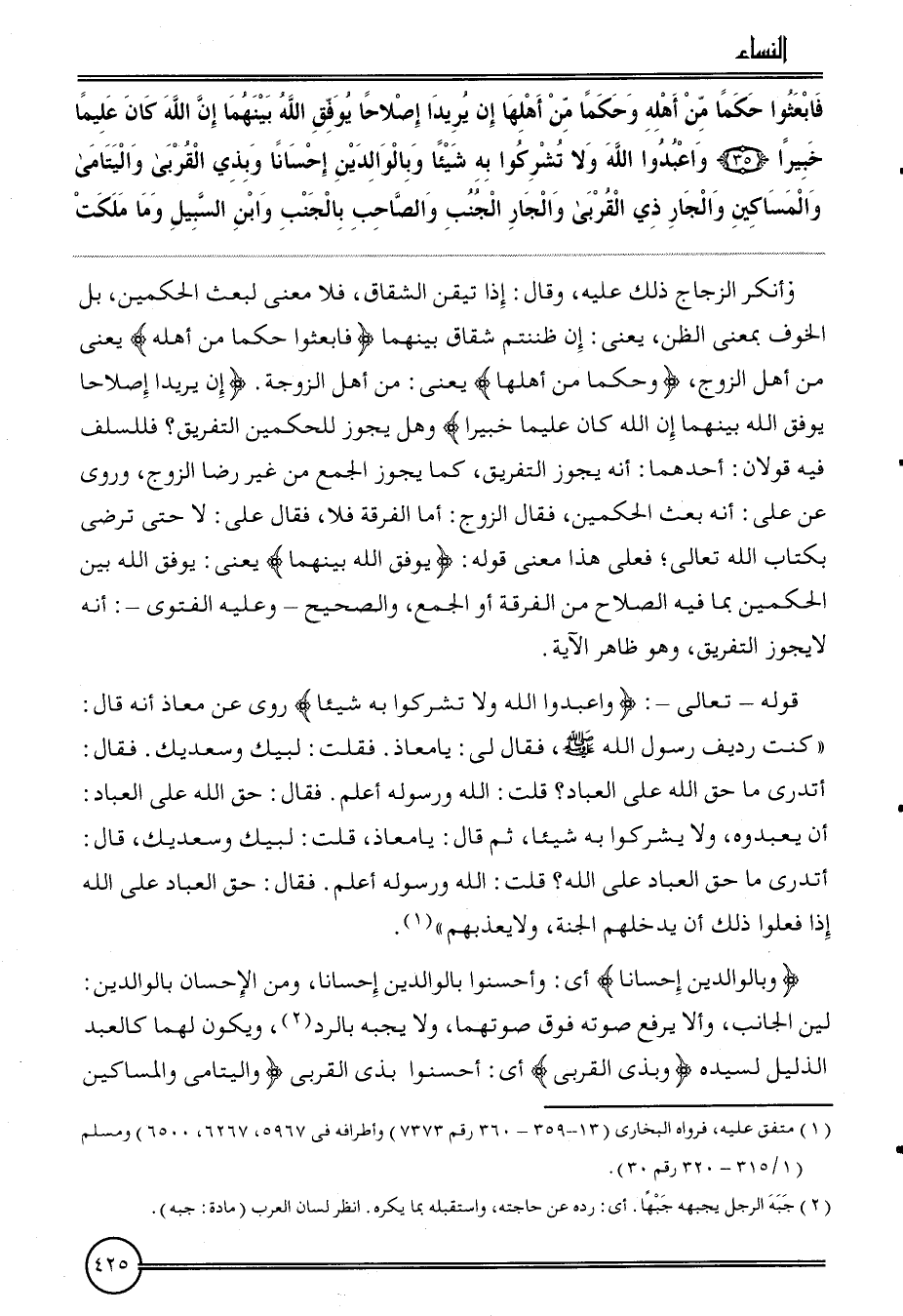 {فَابْعَثُوا حكما من أَهله وَحكما من أَهلهَا إِن يريدا إصلاحا يوفق الله بَينهمَا إِن الله كَانَ عليما خَبِيرا (35) واعبدوا الله وَلَا تُشْرِكُوا بِهِ شَيْئا وبالوالدين إحسانا وبذي الْقُرْبَى واليتامى وَالْمَسَاكِين وَالْجَار ذِي الْقُرْبَى وَالْجَار الْجنب والصاحب بالجنب وَابْن السَّبِيل وَمَا ملكت} وَأنكر الزّجاج ذَلِك عَلَيْهِ، وَقَالَ: إِذا تَيَقّن الشقاق، فَلَا معنى لبعث الْحكمَيْنِ، بل الْخَوْف بِمَعْنى الظَّن، يَعْنِي: إِن ظننتم شقَاق بَينهمَا {فَابْعَثُوا حكما من أَهله} يَعْنِي من أهل الزَّوْج، {وَحكما من أَهلهَا} يَعْنِي: من أهل الزَّوْجَة. {إِن يريدا إصلاحا يوفق الله بَينهمَا إِن الله كَانَ عليما خَبِيرا} وَهل يجوز لِلْحكمَيْنِ التَّفْرِيق؟ فللسلف فِيهِ قَولَانِ: أَحدهمَا: أَنه يجوز التَّفْرِيق، كَمَا يجوز الْجمع من غير رضَا الزَّوْج، وروى عَن عَليّ: أَنه بعث الْحكمَيْنِ، فَقَالَ الزَّوْج: أما الْفرْقَة فَلَا، فَقَالَ عَليّ: لَا حَتَّى ترْضى بِكِتَاب الله تَعَالَى؛ فعلى هَذَا معنى قَوْله: {يوفق الله بَينهمَا} يَعْنِي: يوفق الله بَين الْحكمَيْنِ بِمَا فِيهِ الصّلاح من الْفرْقَة أَو الْجمع، وَالصَّحِيح وَعَلِيهِ الْفَتْوَى: أَنه لَا يجوز التَّفْرِيق، وَهُوَ ظَاهر الْآيَة.
