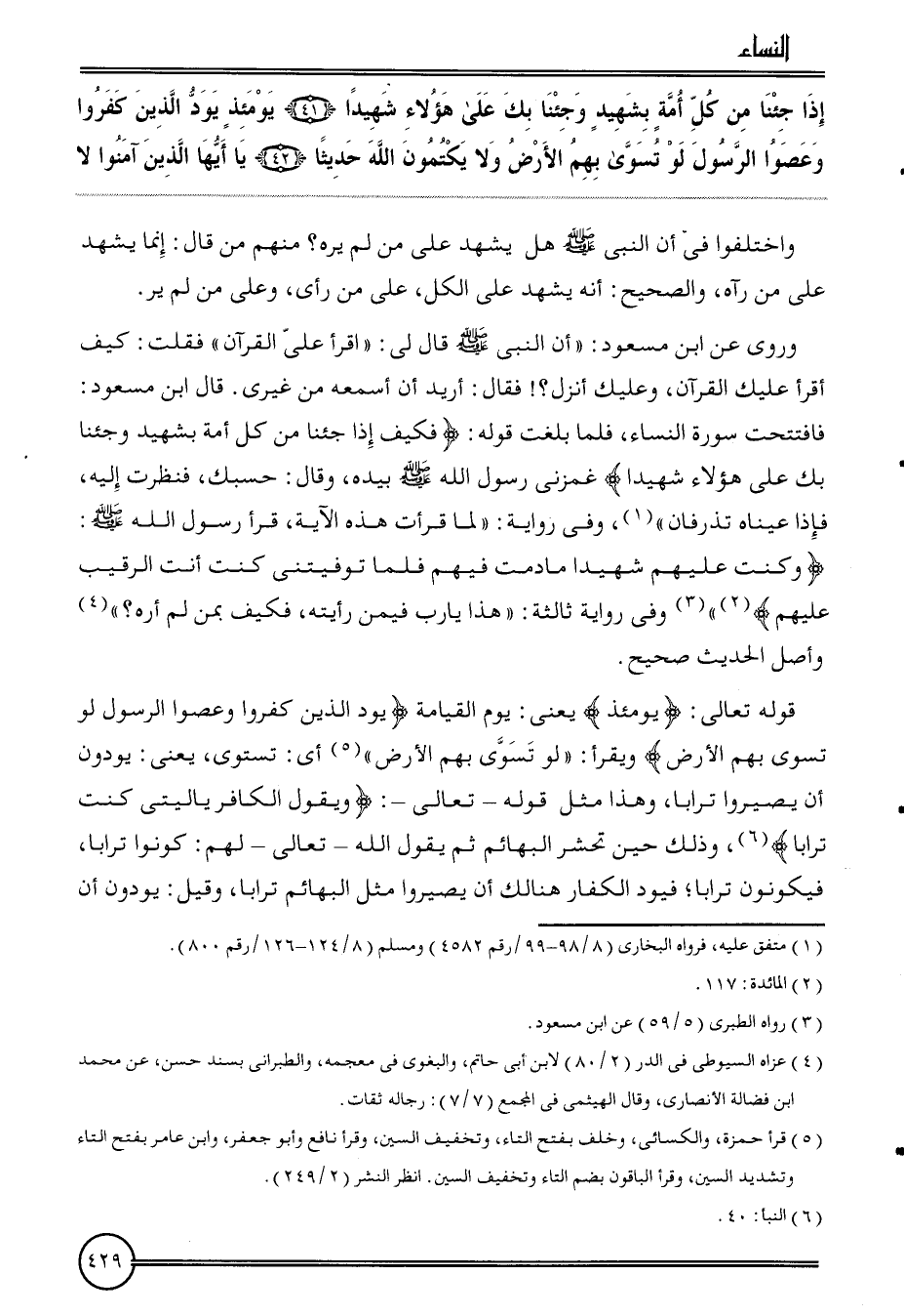 وروى عَن ابْن مَسْعُود: " أَن النَّبِي قَالَ لي: اقْرَأ عَليّ الْقُرْآن " فَقلت: كَيفَ أَقرَأ عَلَيْك الْقُرْآن، وَعَلَيْك أنزل؟ ! فَقَالَ: أُرِيد أَن أسمعهُ من غَيْرِي. قَالَ ابْن مَسْعُود: فافتتحت سُورَة النِّسَاء، فَلَمَّا بلغت قَوْله: {فَكيف إِذا جِئْنَا من كل أمة بِشَهِيد وَجِئْنَا بك على هَؤُلَاءِ شَهِيدا} غمزني رَسُول الله بِيَدِهِ، وَقَالَ: حَسبك، فَنَظَرت إِلَيْهِ، فَإِذا عَيناهُ تَذْرِفَانِ "، وَفِي رِوَايَة: " لما قَرَأت هَذِه الْآيَة، قَرَأَ رَسُول الله: {وَكنت عَلَيْهِم شَهِيدا مَا دمت فيهم فَلَمَّا توفيتني كنت أَنْت الرَّقِيب عَلَيْهِم} " وَفِي رِوَايَة ثَالِثَة: " هَذَا يَا رب فِيمَن رَأَيْته، فَكيف بِمن لم أره؟ " وأصل الحَدِيث صَحِيح.