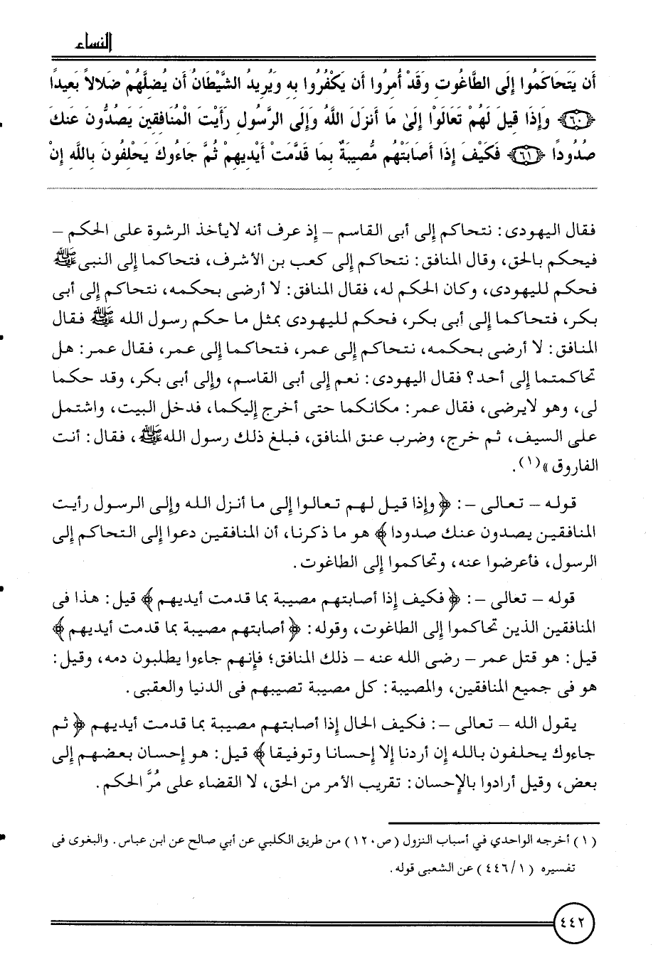 {أَن يتحاكموا إِلَى الطاغوت وَقد أمروا أَن يكفروا بِهِ وَيُرِيد الشَّيْطَان أَن يضلهم ضلالا بَعيدا (60) وَإِذا قيل لَهُم تَعَالَوْا إِلَى مَا أنزل الله وَإِلَى الرَّسُول رَأَيْت الْمُنَافِقين يصدون عَنْك صدودا (61) فَكيف إِذا أَصَابَتْهُم مُصِيبَة بِمَا قدمت أَيْديهم ثمَّ جاءوك يحلفُونَ بِاللَّه إِن} فَقَالَ الْيَهُودِيّ: نَتَحَاكَم إِلَى أبي الْقَاسِم إِذْ عرف أَنه لَا يَأْخُذ الرِّشْوَة على الحكم فَيحكم بِالْحَقِّ، وَقَالَ الْمُنَافِق: نَتَحَاكَم إِلَى كَعْب بن الْأَشْرَف، فتحاكما إِلَى النَّبِي فَحكم لِلْيَهُودِيِّ، وَكَانَ الحكم لَهُ، فَقَالَ الْمُنَافِق: لَا أرْضى بِحكمِهِ، نَتَحَاكَم إِلَى أبي بكر، فتحاكما إِلَى أبي بكر، فَحكم لِلْيَهُودِيِّ بِمثل مَا حكم رَسُول الله فَقَالَ الْمُنَافِق: لَا أرْضى بِحكمِهِ، نَتَحَاكَم إِلَى عمر، فتحاكما إِلَى عمر، فَقَالَ عمر: هَل تحاكمتما إِلَى أحد؟ فَقَالَ الْيَهُودِيّ: نعم إِلَى أبي الْقَاسِم، وَإِلَى أبي بكر، وَقد حكما لي، وَهُوَ لَا يرضى، فَقَالَ عمر: مَكَانكُمَا حَتَّى أخرج إلَيْكُمَا، فَدخل الْبَيْت، واشتمل على السَّيْف، ثمَّ خرج، وَضرب عنق الْمُنَافِق، فَبلغ ذَلِك رَسُول الله، فَقَالَ: أَنْت الْفَارُوق ".