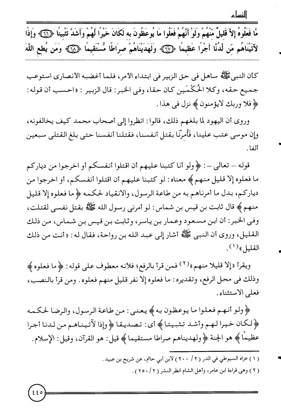 قَوْله - تَعَالَى -: {وَلَو أَنا كتبنَا عَلَيْهِم أَن اقْتُلُوا أَنفسكُم أَو اخْرُجُوا من دِيَاركُمْ مَا فَعَلُوهُ إِلَّا قَلِيل مِنْهُم} مَعْنَاهُ: لَو كتبنَا عَلَيْهِم أَن اقْتُلُوا أَنفسكُم، أَو اخْرُجُوا من دِيَاركُمْ، بدل مَا أمرناهم بِهِ من طَاعَة الرَّسُول، والانقياد لحكمه {مَا فَعَلُوهُ إِلَّا قَلِيل مِنْهُم} قَالَ ثَابت بن قيس بن شماس: لَو أَمرنِي رَسُول الله بقتل نَفسِي لقتلت، وَفِي الْخَبَر: أَن ابْن مَسْعُود وعمار بن يَاسر، وثابت بن قيس بن شماس، من ذَلِك الْقَلِيل، وروى أَن النَّبِي أَشَارَ إِلَى عبد الله بن رَوَاحه، فَقَالَ لَهُ: " أَنْت من ذَلِك الْقَلِيل ".