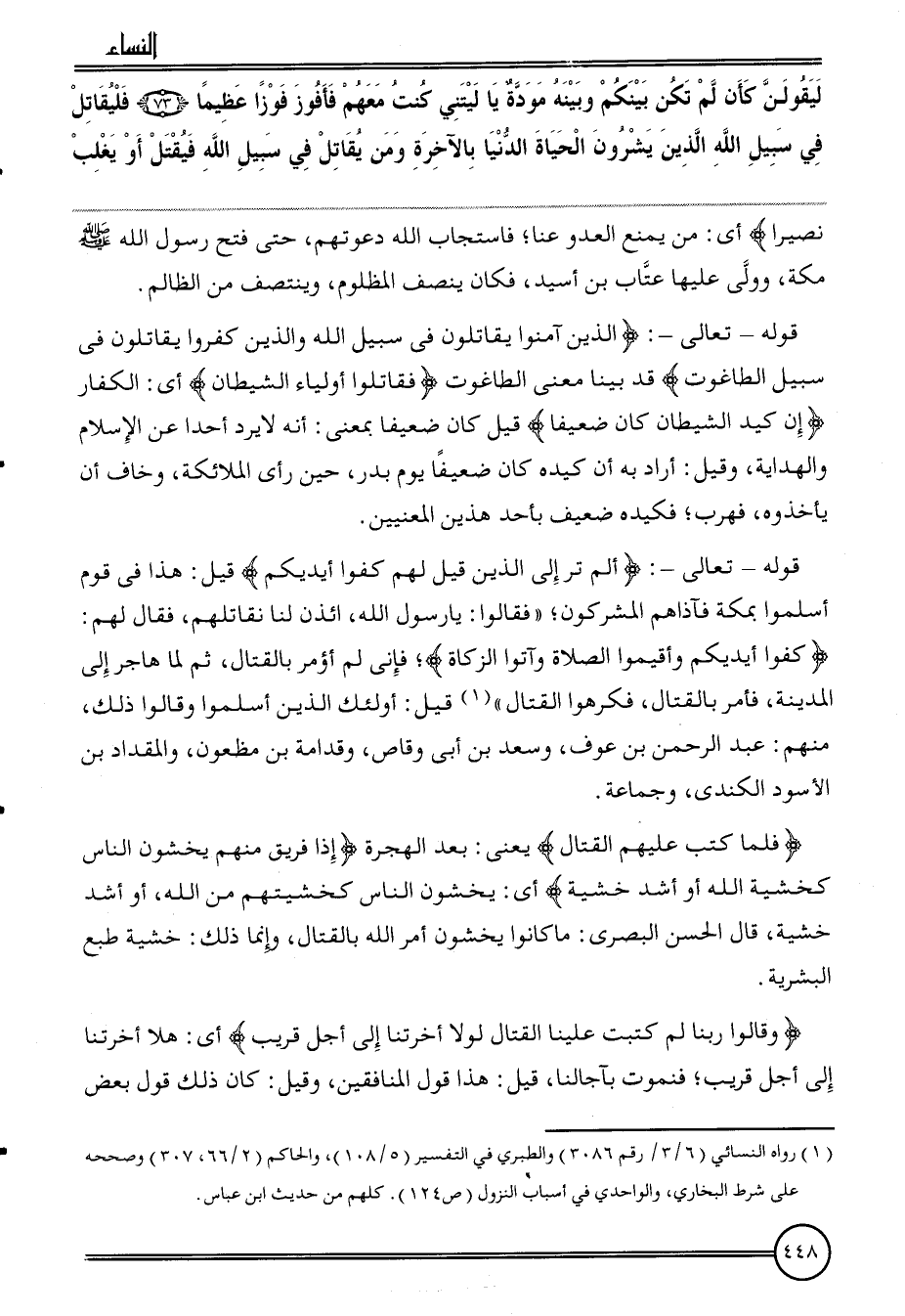 قَوْله - تَعَالَى -: {ألم تَرَ إِلَى الَّذين قيل لَهُم كفوا أَيْدِيكُم} قيل: هَذَا فِي قوم أَسْلمُوا بِمَكَّة فآذاهم الْمُشْركُونَ؛ " فَقَالُوا: يَا رَسُول الله، ائْذَنْ لنا نقاتلهم، فَقَالَ لَهُم: {كفوا أَيْدِيكُم وَأقِيمُوا الصَّلَاة وَآتوا الزَّكَاة} ؛ فَإِنِّي لم أُؤمر بِالْقِتَالِ، ثمَّ لما هَاجر إِلَى الْمَدِينَة، فَأمر بِالْقِتَالِ، فكرهوا الْقِتَال " قيل: أُولَئِكَ الَّذين أَسْلمُوا وَقَالُوا ذَلِك، مِنْهُم: عبد الرَّحْمَن بن عَوْف، وَسعد بن أبي وَقاص، وَقُدَامَة بن مَظْعُون، والمقداد بن الْأسود الْكِنْدِيّ، وَجَمَاعَة.
