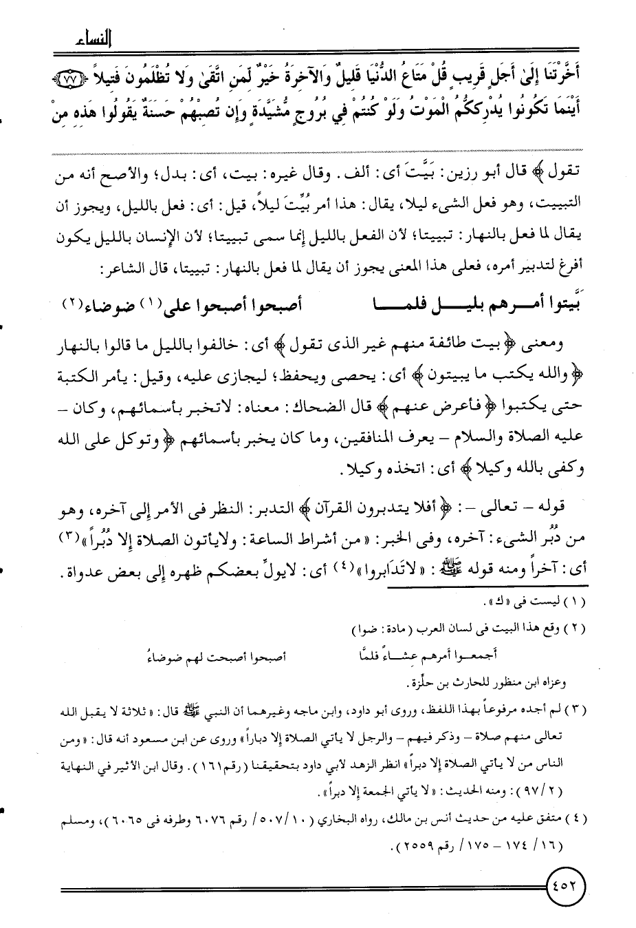 {أخرتنا إِلَى أجل قريب قل مَتَاع الدُّنْيَا قَلِيل وَالْآخِرَة خير لمن اتَّقى وَلَا تظْلمُونَ فتيلا (77) أَيْنَمَا تَكُونُوا يدرككم الْمَوْت وَلَو كُنْتُم فِي بروج مشيدة وَإِن تصبهم حَسَنَة يَقُولُوا هَذِه من} {تَقول} قَالَ أَبُو رزين: بَيت أَي: ألف. وَقَالَ غَيره: بَيت، أَي: بدل؛ وَالأَصَح أَنه من التبييت، وَهُوَ فعل الشَّيْء لَيْلًا، يُقَال: هَذَا أَمر بَيت لَيْلًا، قيل: أَي: فعل بِاللَّيْلِ، وَيجوز أَن يُقَال لما فعل بِالنَّهَارِ: تبييتا؛ لِأَن الْفِعْل بِاللَّيْلِ إِنَّمَا سمى تبييتا؛ لِأَن الْإِنْسَان بِاللَّيْلِ يكون أفرغ لتدبير أمره، فعلى هَذَا الْمَعْنى يجوز أَن يُقَال لما فعل بِالنَّهَارِ: تبييتا، قَالَ الشَّاعِر: