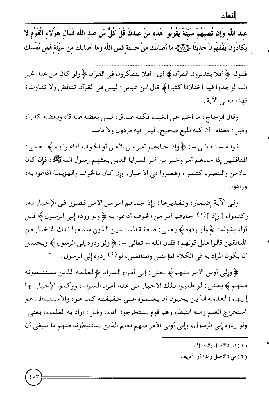 {عِنْد الله وَإِن تصبهم سَيِّئَة يَقُولُوا هَذِه من عنْدك قل كل من عِنْد الله فَمَال هَؤُلَاءِ الْقَوْم لَا يكادون يفقهُونَ حَدِيثا (78) مَا أَصَابَك من حَسَنَة فَمن الله وَمَا أَصَابَك من سَيِّئَة فَمن نَفسك} فَقَوله {أَفلا يتدبرون الْقُرْآن} أَي: أَفلا يتفكرون فِي الْقُرْآن {وَلَو كَانَ من عِنْد غير الله لوجدوا فِيهِ اخْتِلَافا كثيرا} قَالَ ابْن عَبَّاس: لَيْسَ فِي الْقُرْآن تنَاقض وَلَا تفَاوت؛ فَهَذَا معنى الْآيَة.