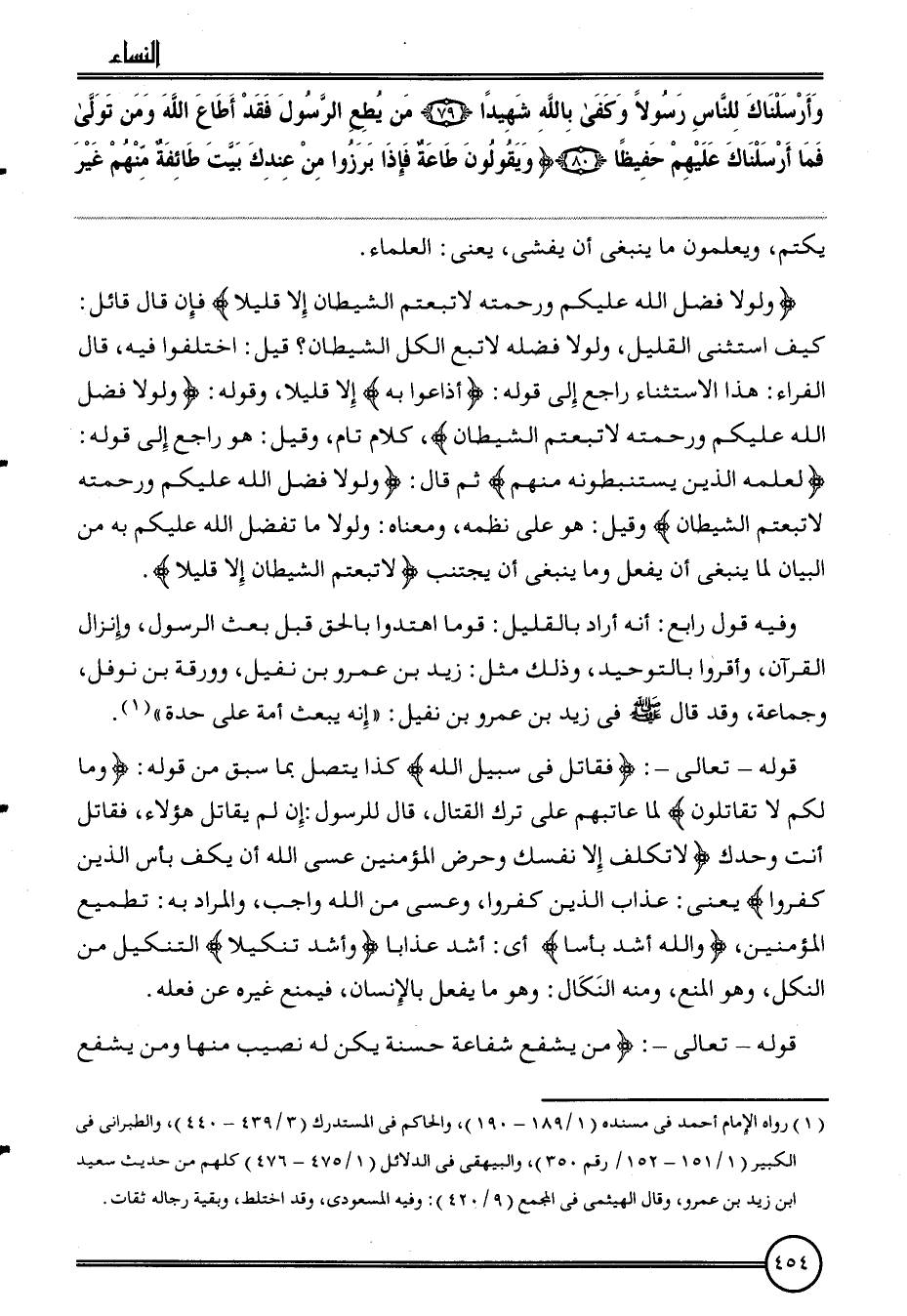 {وَلَوْلَا فضل الله عَلَيْكُم وَرَحمته لاتبعتم الشَّيْطَان إِلَّا قَلِيلا} فَإِن قَالَ قَائِل: كَيفَ اسْتثْنى الْقَلِيل، وَلَوْلَا فَضله لاتبع الْكل الشَّيْطَان؟ قيل: اخْتلفُوا فِيهِ، قَالَ الْفراء: هَذَا الِاسْتِثْنَاء رَاجع إِلَى قَوْله: {أذاعوا بِهِ} إِلَّا قَلِيلا، وَقَوله: {وَلَوْلَا فضل الله عَلَيْكُم وَرَحمته لَا تبعتم الشَّيْطَان} ، كَلَام تَامّ، وَقيل: هُوَ رَاجع إِلَى قَوْله: {لعلمه الَّذين يستنبطونه مِنْهُم} ثمَّ قَالَ: {وَلَوْلَا فضل الله عَلَيْكُم وَرَحمته لَا تبعتم الشَّيْطَان} وَقيل: هُوَ على نظمه، وَمَعْنَاهُ: وَلَوْلَا مَا تفضل الله عَلَيْكُم بِهِ من الْبَيَان لما يَنْبَغِي أَن يفعل وَمَا يَنْبَغِي أَن يجْتَنب {لاتبعتم الشَّيْطَان إِلَّا قَلِيلا} .