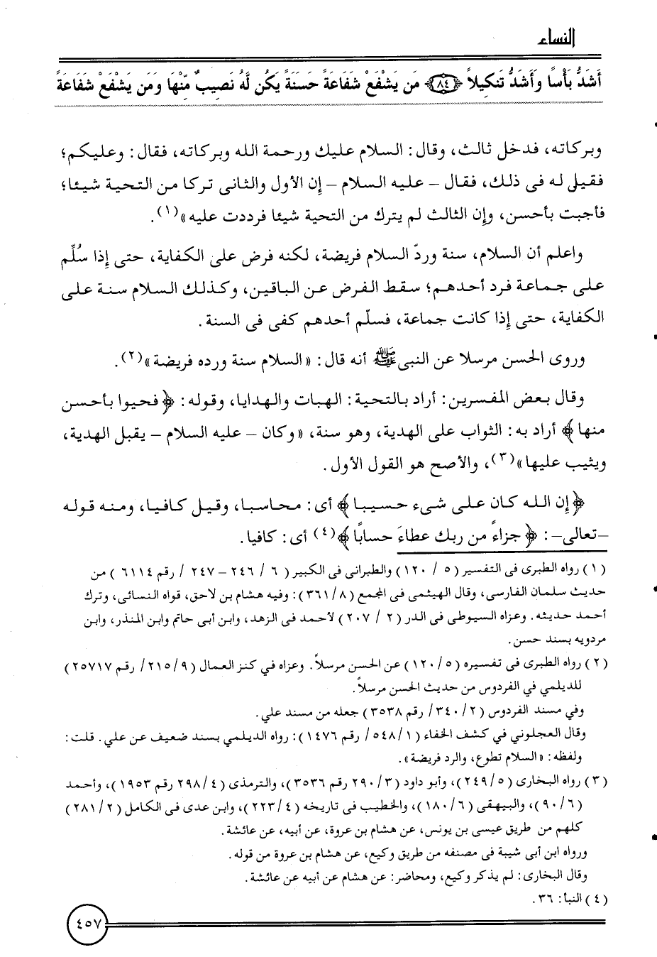 {أَشد بَأْسا وَأَشد تنكيلا (84) من يشفع شَفَاعَة حَسَنَة يكن لَهُ نصيب مِنْهَا وَمن يشفع شَفَاعَة} وَبَرَكَاته، فَدخل ثَالِث، وَقَالَ: السَّلَام عَلَيْك وَرَحْمَة الله وَبَرَكَاته، فَقَالَ: وَعَلَيْكُم؛ فَقيل لَهُ فِي ذَلِك، فَقَالَ - عَلَيْهِ السَّلَام - إِن الأول وَالثَّانِي تركا من التَّحِيَّة شَيْئا؛ فأجبت بِأَحْسَن، وَإِن الثَّالِث لم يتْرك من التَّحِيَّة شَيْئا فَرددت عَلَيْهِ ".