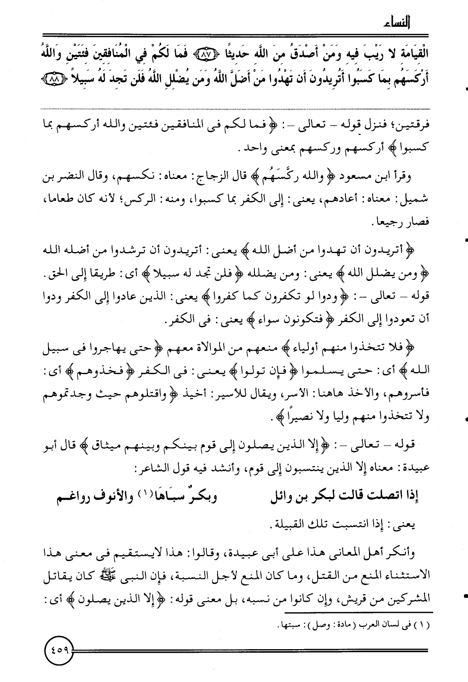 {الْقِيَامَة لَا ريب فِيهِ وَمن أصدق من الله حَدِيثا (87) فَمَا لكم فِي الْمُنَافِقين فئتين وَالله أركسهم بِمَا كسبوا أتريدون أَن تهدوا من أضلّ الله وَمن يضلل الله فَلَنْ تَجِد لَهُ سَبِيلا (88) } فرْقَتَيْن؛ فَنزل قَوْله - تَعَالَى -: {فَمَا لكم فِي الْمُنَافِقين فئتين وَالله أركسهم بِمَا كسبوا} أركسهم وركسهم بِمَعْنى وَاحِد.