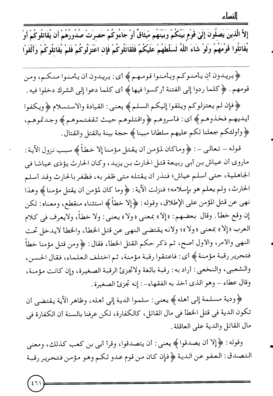 قَوْله تَعَالَى: {وَمَا كَانَ لمُؤْمِن أَن يقتل مُؤمنا إِلَّا خطأ} سَبَب نزُول الْآيَة: مَا روى أَن عَيَّاش بن أبي ربيعَة قتل الْحَارِث بن يزِيد، وَكَانَ الْحَارِث يُؤْذِي عياشا فِي الْجَاهِلِيَّة، حَتَّى أسلم عَيَّاش؛ فَنَذر أَن يقْتله مَتى ظفر بِهِ، فظفر بِالْحَارِثِ وَقد أسلم الْحَارِث، وَلم يعلم هُوَ بِإِسْلَامِهِ، فَنزلت الْآيَة: {وَمَا كَانَ لمُؤْمِن أَن يقتل مُؤمنا} وَهَذَا نهى عَن قتل الْمُؤمن على الْإِطْلَاق، وَقَوله: {إِلَّا خطأ} اسْتثِْنَاء مُنْقَطع، وَمَعْنَاهُ: لَكِن إِن وَقع خطأ. وَقَالَ بَعضهم: " إِلَّا " بِمَعْنى " وَلَا " يعْنى: وَلَا خطأ، وَلَا يعرف فِي كَلَام الْعَرَب " إِلَّا " بِمَعْنى " وَلَا "؛ وَلِأَنَّهُ يَقْتَضِي النَّهْي عَن قتل الْخَطَأ، وَالْخَطَأ لَا يدْخل تَحت النَّهْي وَالْأَمر، وَالْأول أصح، ثمَّ ذكر حكم الْقَتْل الْخَطَأ، فَقَالَ: {وَمن قتل مُؤمنا خطأ فَتَحْرِير رَقَبَة مُؤمنَة} أَي: فاعتقوا رَقَبَة مُؤمنَة، ثمَّ اخْتلف الْعلمَاء، فَقَالَ الْحسن، وَالشعْبِيّ، وَالنَّخَعِيّ: أَرَادَ بِهِ: رَقَبَة بَالِغَة وَلَا تُجزئ الرَّقَبَة الصَّغِيرَة، وَإِن كَانَت مُؤمنَة، وَقَالَ عَطاء وَهُوَ الَّذِي أَخذ بِهِ الْفُقَهَاء: إِنَّه تُجزئ الصَّغِيرَة.