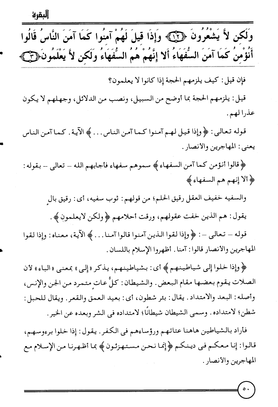 {وَلَكِن لَا يَشْعُرُونَ (12) وَإِذا قيل لَهُم آمنُوا كَمَا آمن النَّاس قَالُوا أنؤمن كَمَا آمن السُّفَهَاء أَلا إِنَّهُم هم السُّفَهَاء وَلَكِن لَا يعلمُونَ (13) }