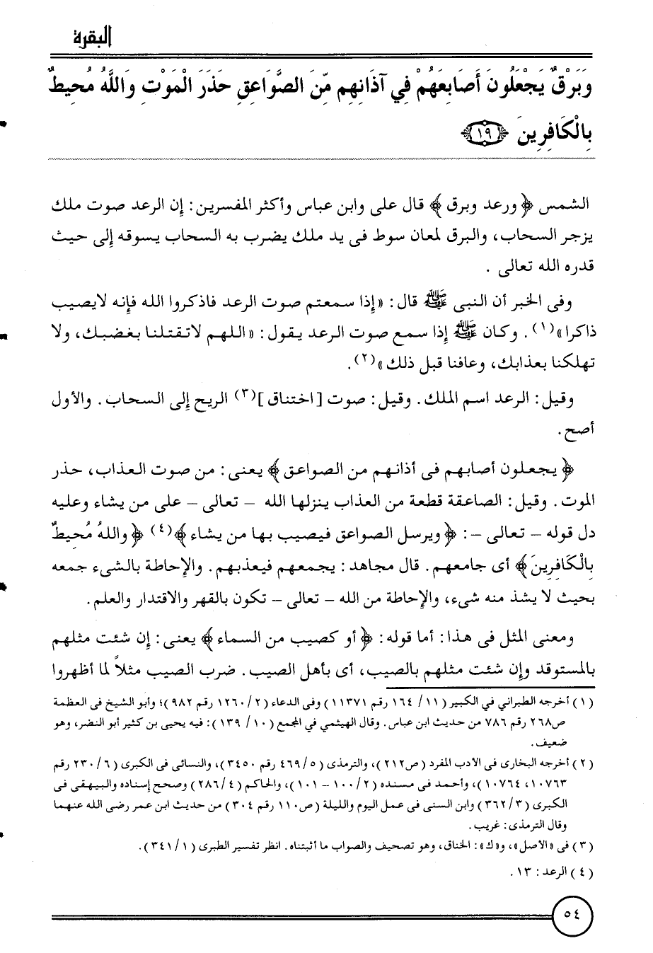 {يجْعَلُونَ أَصَابِعهم فِي آذانهم من الصَّوَاعِق} يَعْنِي: من الصَّوْت الْعَذَاب، حذر الْمَوْت. وَقيل: الصاعقة قِطْعَة من الْعَذَاب ينزلها الله تَعَالَى على من يَشَاء وَعَلِيهِ دلّ قَوْله تَعَالَى {وَيُرْسل الصَّوَاعِق فَيُصِيب بهَا من يَشَاء} {وَالله مُحِيط بالكافرين} أَي جامعهم. قَالَ مُجَاهِد: يجمعهُمْ فيعذبهم. والإحاطة بالشَّيْء جمعه بِحَيْثُ لَا يشذ مِنْهُ شئ، والإحاطة من الله تَعَالَى تكون بالقهر والاقتدار وَالْعلم.