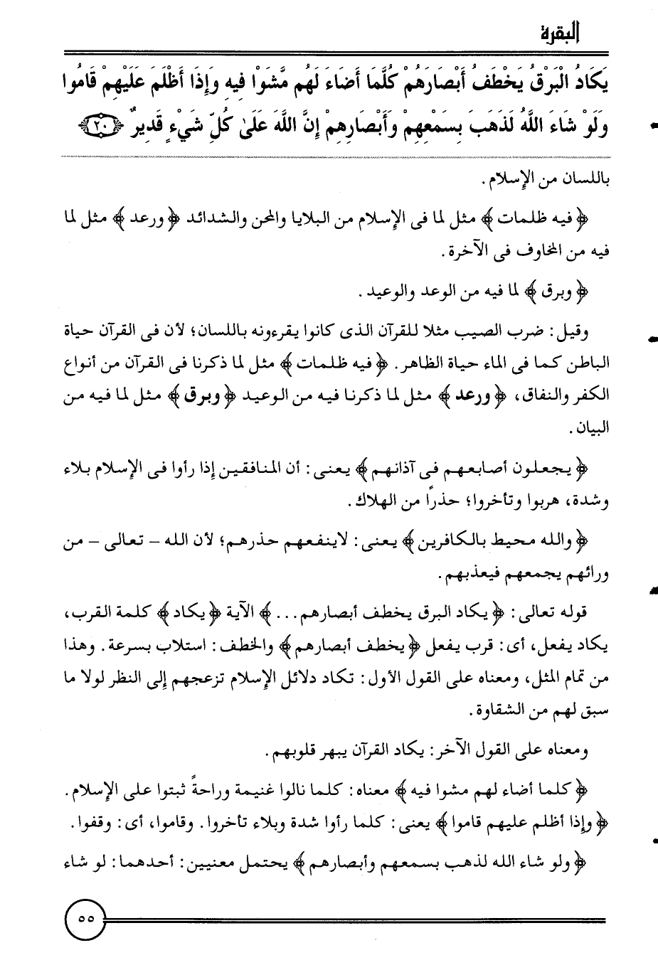 {يكَاد الْبَرْق يخطف أَبْصَارهم كلما أَضَاء لَهُم مَشوا فِيهِ وَإِذا أظلم عَلَيْهِم قَامُوا وَلَو شَاءَ لله لذهب بسمعهم وأبصارهم إِن الله على كل شَيْء قدير (20) } بِاللِّسَانِ من الْإِسْلَام.