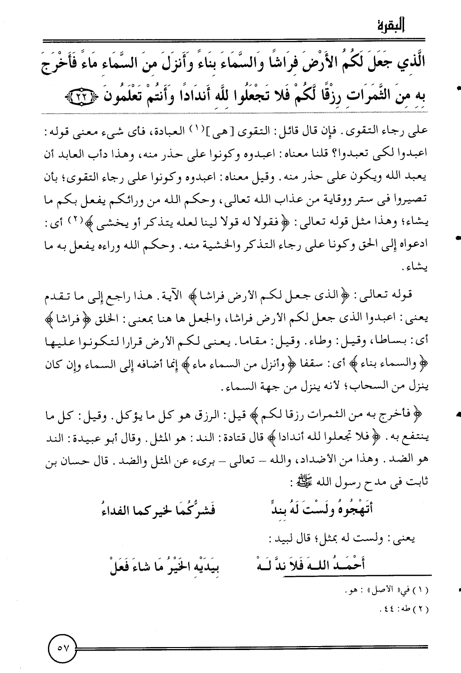 {الَّذِي جعل لكم الأَرْض فراشا وَالسَّمَاء بِنَاء وَأنزل من السَّمَاء مَاء فَأخْرج بِهِ من الثمرات رزقا لكم فَلَا تجْعَلُوا لله أندادا وَأَنْتُم تعلمُونَ (22) } على رَجَاء التَّقْوَى. فَإِن قَالَ قَائِل: التَّقْوَى [هِيَ] (1) الْعِبَادَة، فَأَي شَيْء معنى قَوْله: اعبدوا لكَي تعبدوا؟ قُلْنَا مَعْنَاهُ: اعبدوه وَكُونُوا على حذر مِنْهُ، وَهَذَا دأب العابد أَن يعبد الله وَيكون على حذر مِنْهُ. وَقيل مَعْنَاهُ: اعبدوه وَكُونُوا على رَجَاء التَّقْوَى؛ بِأَن تصيروا فِي ستر ووقاية من عَذَاب الله تَعَالَى، وَحكم الله من وَرَائِكُمْ يفعل بكم مَا يَشَاء؛ وَهَذَا مثل قَوْله تَعَالَى: {فقولا لَهُ قولا لينًا لَعَلَّه يتَذَكَّر أَو يخْشَى} أَي: ادعواه إِلَى الْحق وكونا على رَجَاء التَّذَكُّر والخشية مِنْهُ. وَحكم الله وَرَاءه يفعل بِهِ مَا يَشَاء.