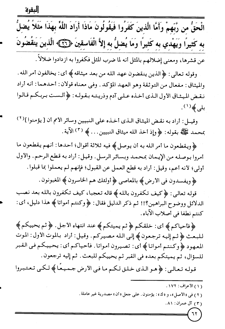 {الْحق من رَبهم وَأما الَّذين كفرُوا فَيَقُولُونَ مَاذَا أَرَادَ الله بِهَذَا مثلا يضل بِهِ كثيرا وَيهْدِي بِهِ كثيرا وَمَا يضل بِهِ إِلَّا الْفَاسِقين (26) الَّذين ينقضون} عَن قشرها، وَمعنى إضلالهم بِالْمثلِ أَنه لما ضرب الْمثل فَكَفرُوا بِهِ ازدادوا ضلالا.
