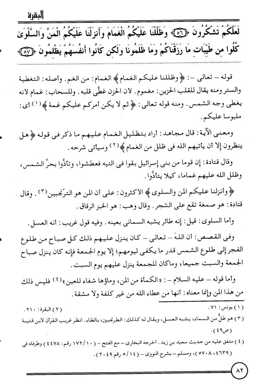 {وأنزلنا عَلَيْكُم الْمَنّ والسلوى} الْأَكْثَرُونَ: على أَن الْمَنّ هُوَ الترنجبين. وَقَالَ قَتَادَة: هُوَ صمغة تقع على الشّجر. وَقَالَ وهب: هُوَ الْخبز الرقَاق.