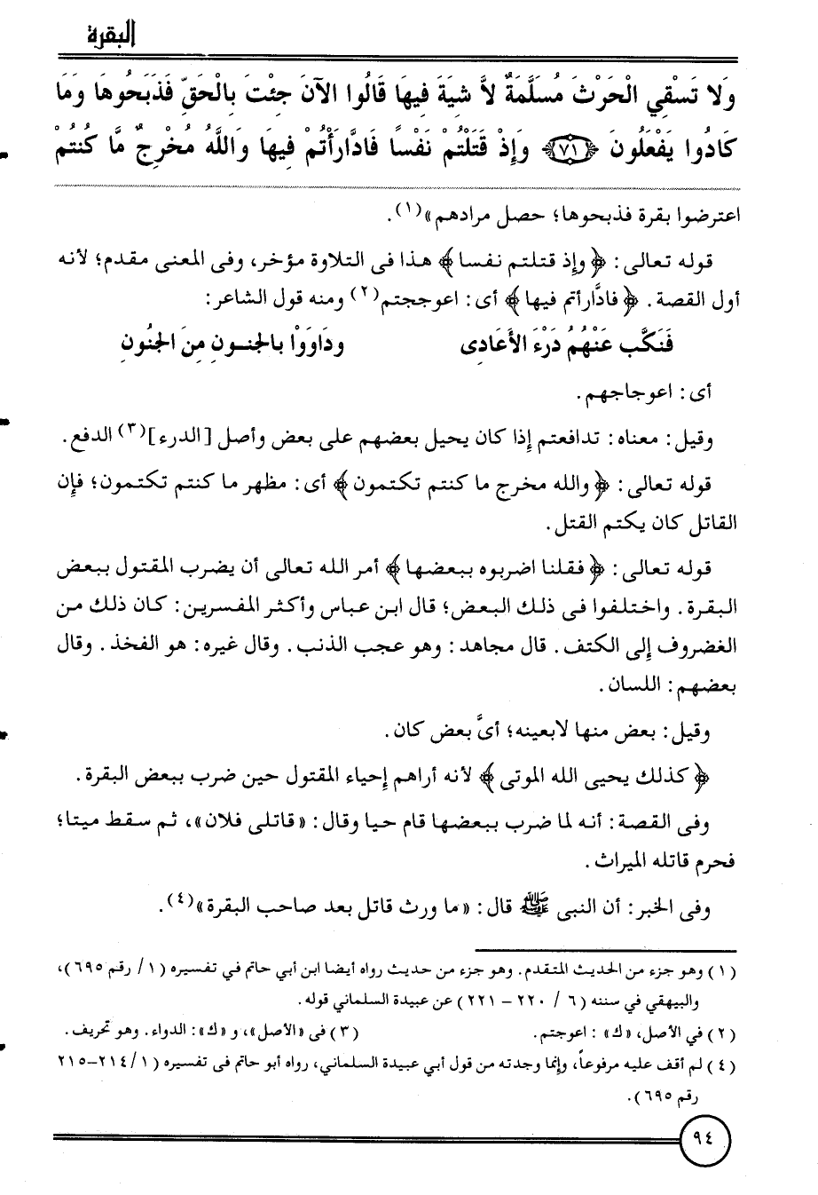 {وَلَا تَسْقِي الْحَرْث مسلمة لَا شية فِيهَا قَالُوا الْآن جِئْت بِالْحَقِّ فذبحوها وَمَا كَادُوا يَفْعَلُونَ (71) وَإِذ قتلتم نفسا فادارأتم فِيهَا وَالله مخرج مَا كُنْتُم اعْترضُوا بقرة فذبحوها؛ حصل مُرَادهم ".
