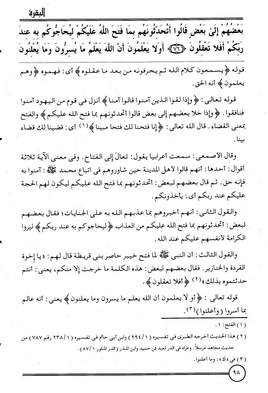 وَقَالَ الْأَصْمَعِي: سَمِعت أَعْرَابِيًا يَقُول: تعال إِلَى الفتاح. وَفِي معنى الْآيَة ثَلَاثَة أَقْوَال: أَحدهَا: أَنهم قَالُوا لأهل الْمَدِينَة حِين شاوروهم فِي اتِّبَاع مُحَمَّد: آمنُوا بِهِ فَإِنَّهُ حق. ثمَّ قَالَ بَعضهم لبَعض: أتحدثونهم بِمَا فتح الله عَلَيْكُم ليَكُون لَهُم الْحجَّة عَلَيْكُم عِنْد ربكُم أَي: يأخذونكم.