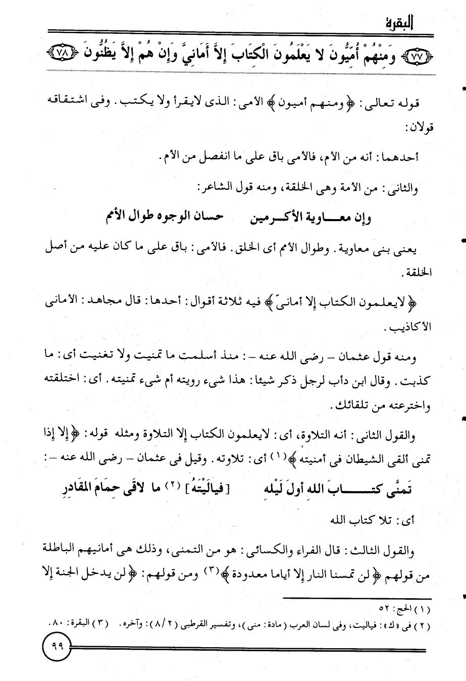 وَالْقَوْل الثَّانِي: أَنه التِّلَاوَة، أَي: لَا يعلمُونَ الْكتاب إِلَّا التِّلَاوَة وَمثله وَقَوله: {إِلَّا إِذا تمنى ألْقى الشَّيْطَان فِي أمْنِيته} أَي: تِلَاوَته. وَقيل فِي عُثْمَان رَضِي الله عَنهُ: